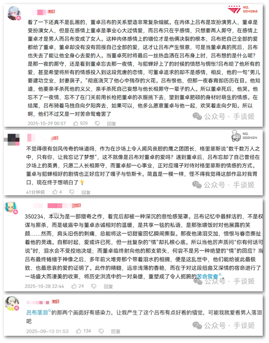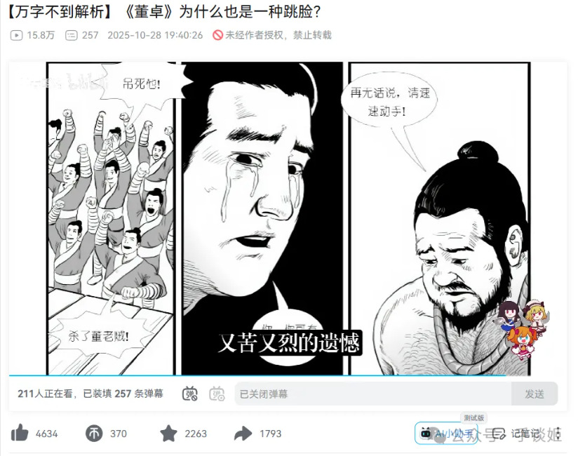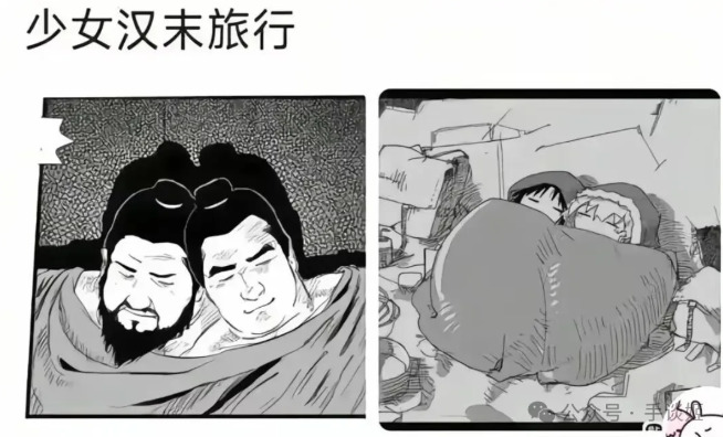 漫画其实之前就火了一段时间,有人在群里发某神秘网站的番号,大家以为是什么好东西,结果点开以后就会看到肥硕的董卓倚偎在吕布身上,可以说是开幕雷击,按着B站某UP主的说话,这也算是某种跳杀了。