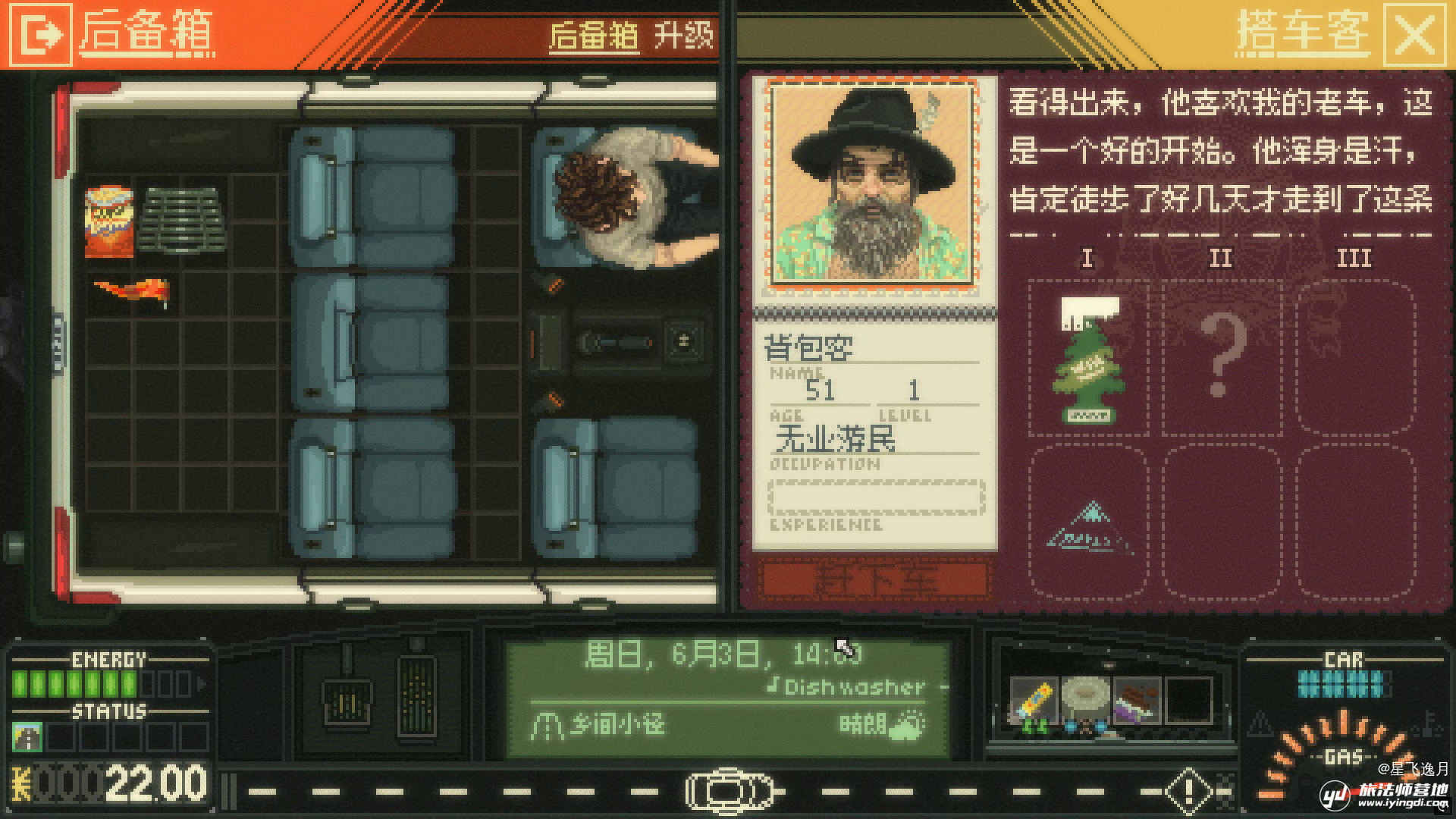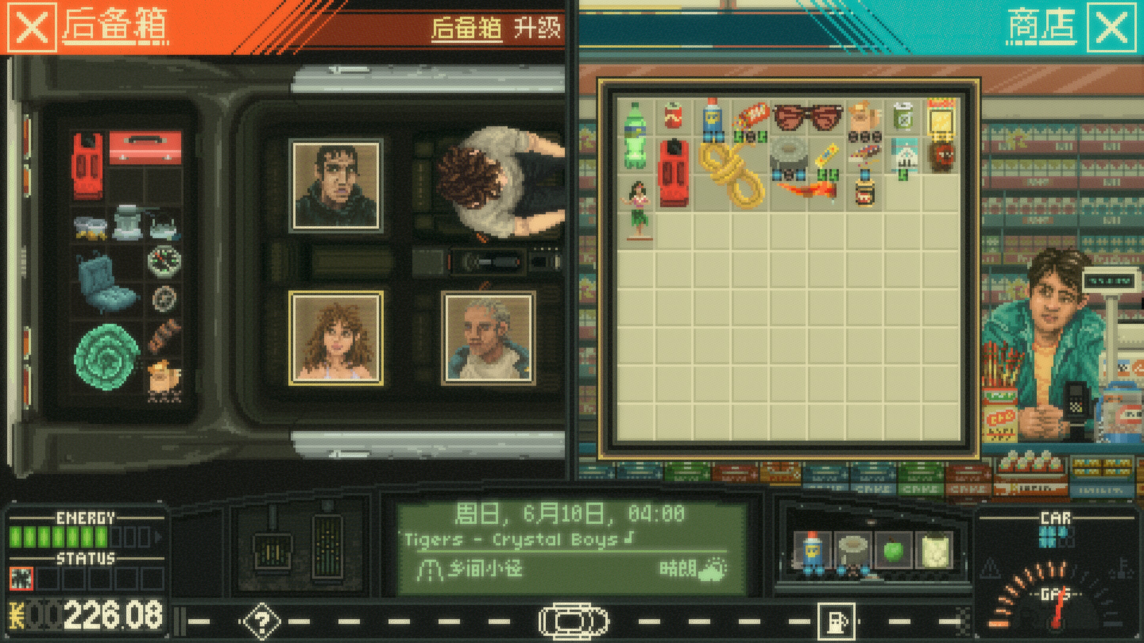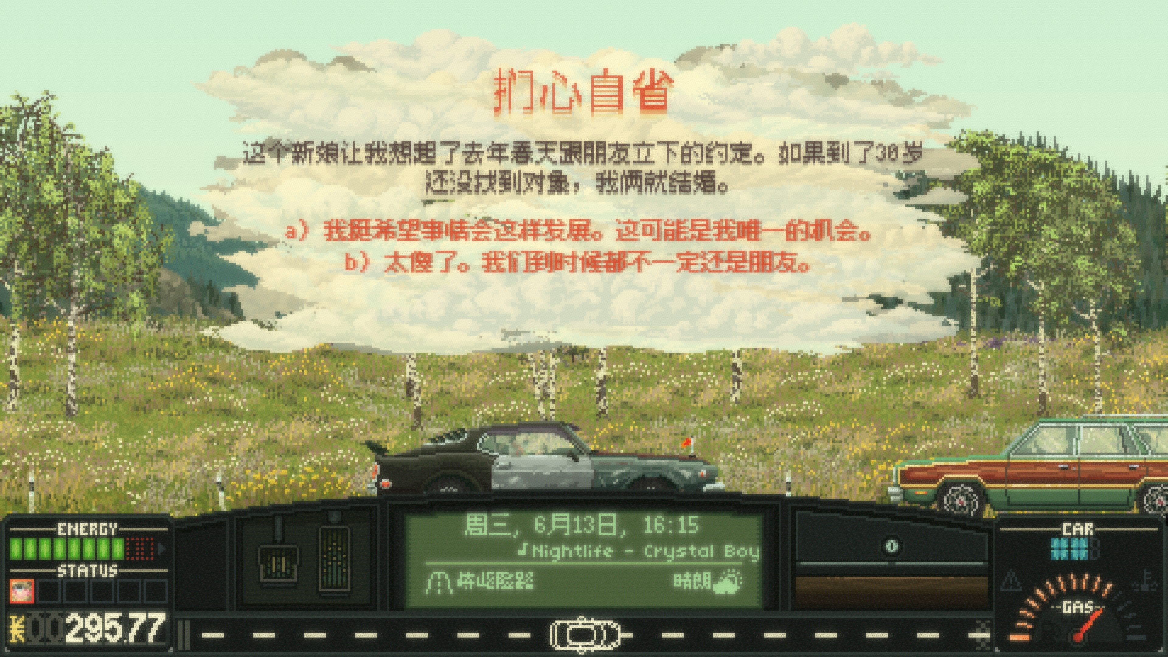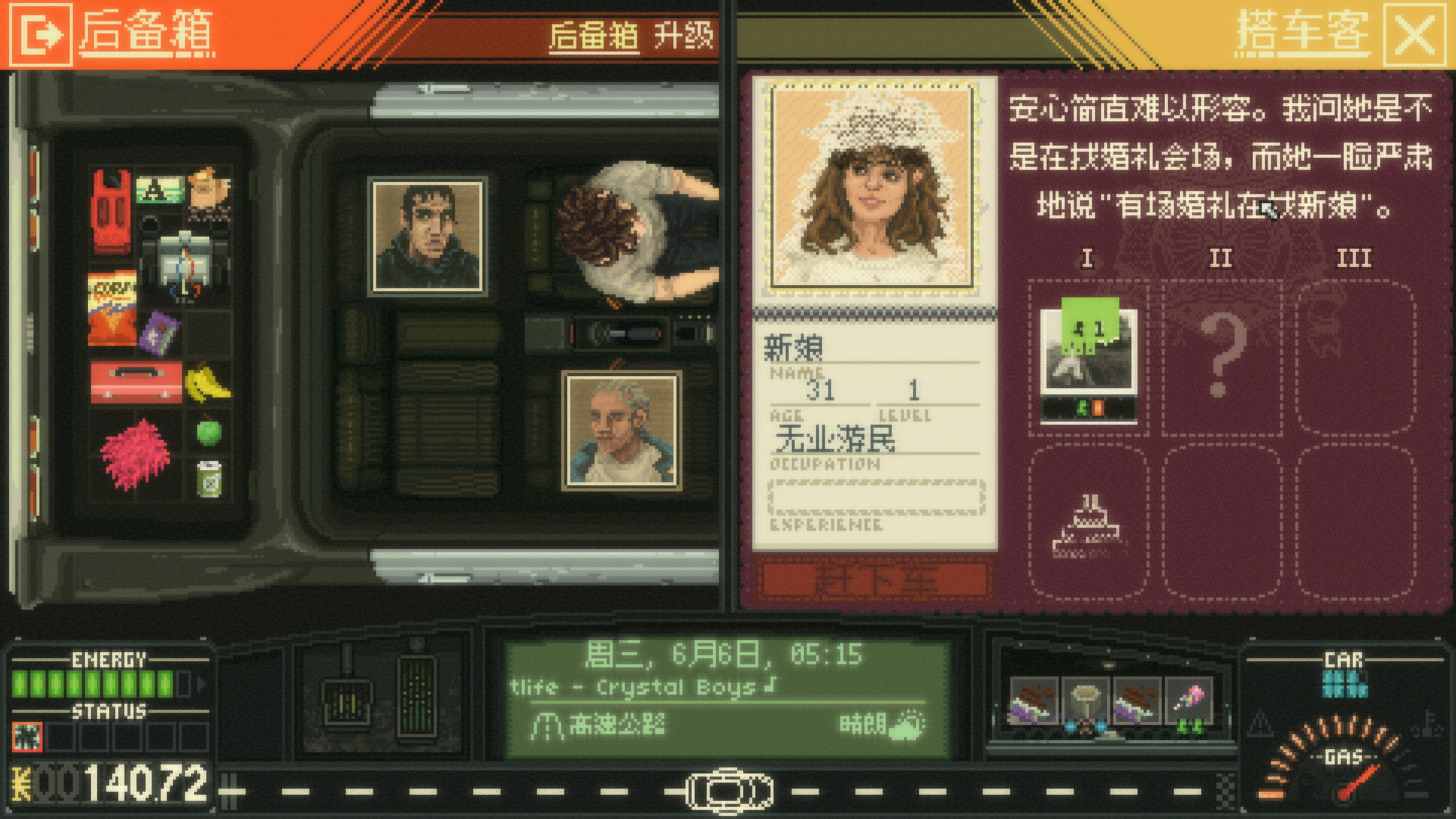 游戏的大部分时间里我们都是与爱车相伴,一边在公路上行驶,一边思考人生的意义。在这趟说走就走的旅途中,我们会遇到形形色色的搭车客,有时候是半路抛锚的修理工,有时候是逃婚的准新娘,有时候是从国外来旅游的情侣……搭车客也成为了这款游戏的灵魂,并非每个人在上车前都有明确的目的地,有的人只是不想留在原地,随着旅行的开始,他们也许会逐渐找到自己的目标,而我们更像是引路人的身份,在帮助他人的同时也在寻找那份属于自己的人生意义。