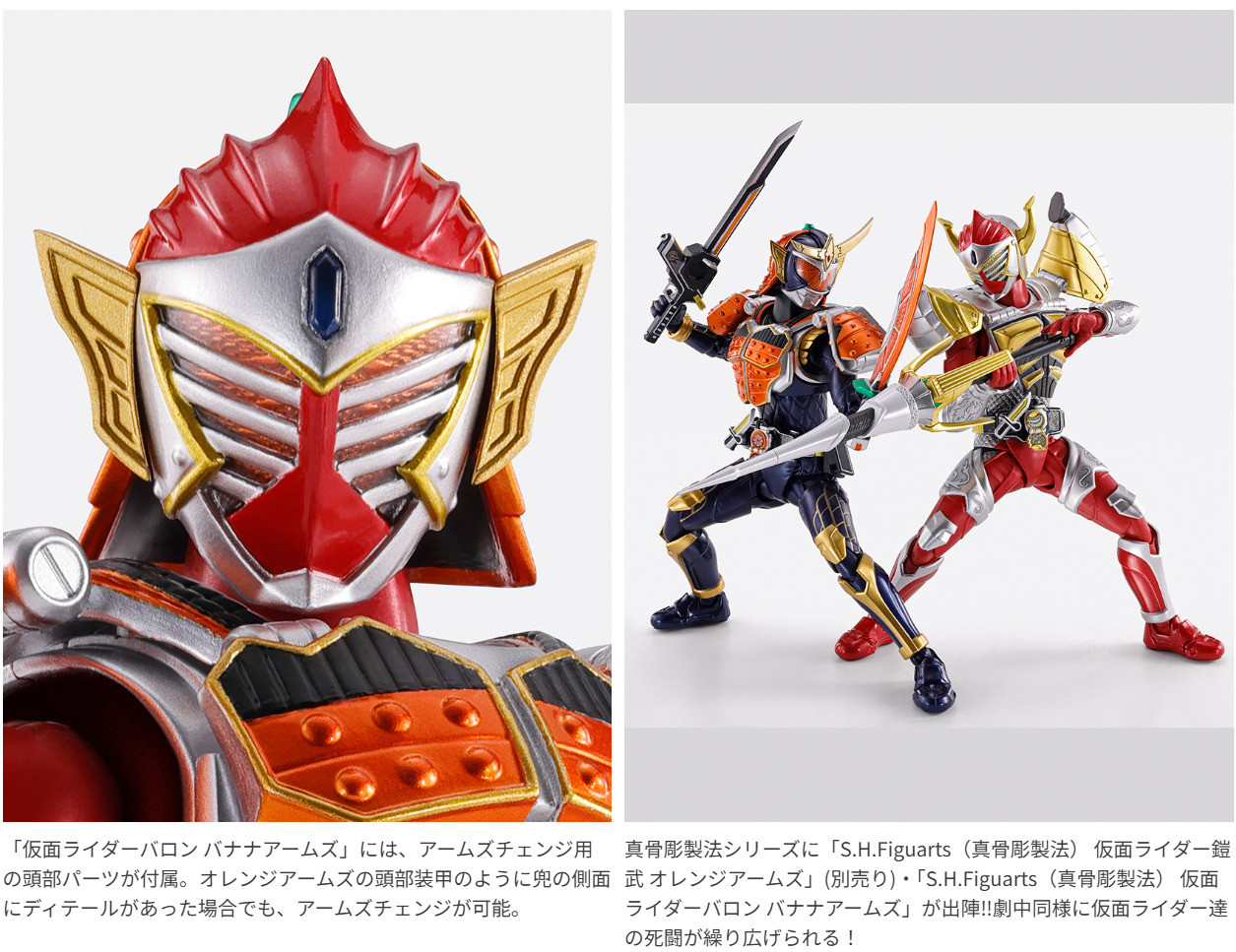 「仮面ライダーバロン バナナアームズ」が、アームズチェンジを備えた最新フォーマットで真骨彫製法シリーズとして登場。S.H.Figuarts(真骨彫製法)仮面ライダーバロンも、他仮面ライダーの装備とアームズチェンジが可能!シリーズのスタートアイテムである「仮面ライダー鎧武 オレンジアームズ」と「仮面ライダーバロン バナナアームズ」を連月発売!