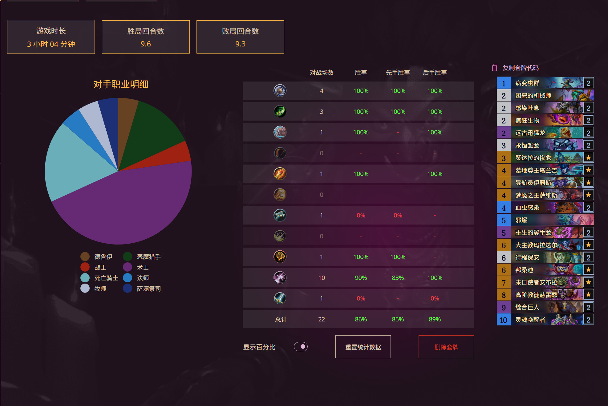 自从我换了这个卡组之后没碰到过星灵法。到时碰到过一个麦迪文奇迹牧。也是吃了不认识卡的亏。差8点血没把地面打死。对面满月了,鲍勃抽了3个伊利斯地标,我直接放弃。主要是对面有俩打包,清空了我的场面。牧师直接不做评价。网友发挥吧。