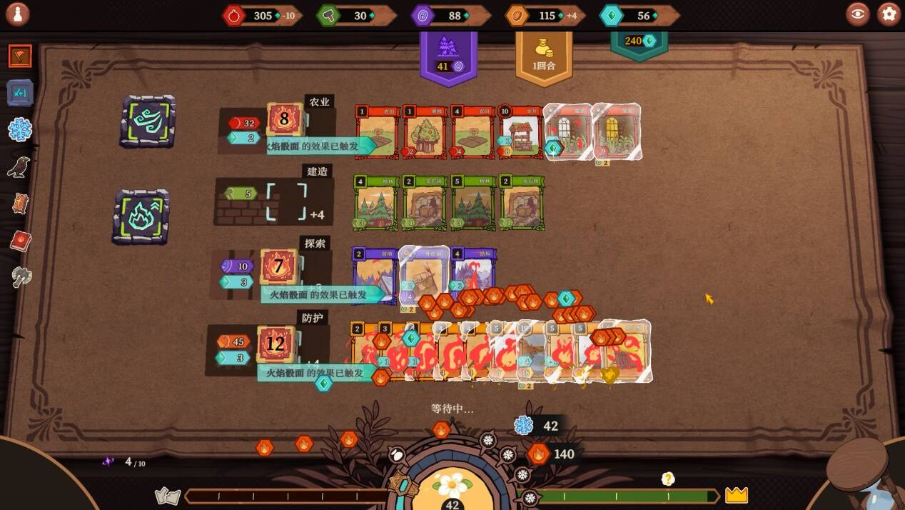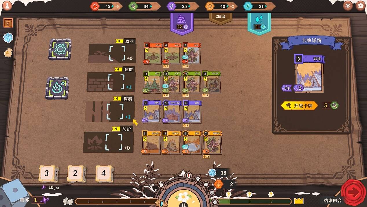 - 手握三枚骰子,请运用智慧将它们分配到农业、建造、探索、守护四大区域,以激活卡牌,获取宝贵资源。
