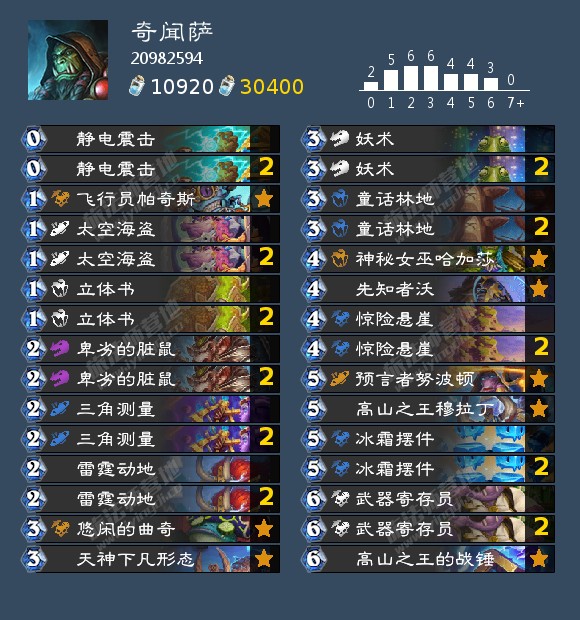 修修补补终于靠萨满十星打上了传说,这套卡组是我最终针对环境改出来的卡组。优假人战星灵牧,小优刀贼撕裂术,和奇闻dk55开,劣任务术和补水战。另外打龙战留牌正确就是小优,但要是留成针对假人的脏鼠加呱就是劣势了。哈加沙摆件的组合打快攻还是太权威了,五费两个4血墙加八甲赠送一个55的含金量。脏鼠加呱针对假人战,另外预言者地标的呱可以指大乌龟也是个赢点。还有一点面对刀贼可以留帕奇斯,这样他的弑君基本都会抽降落伞,降落伞也是传说卡,白抽牌还送个11。此外个人感觉这个版本萨满的两张橙卡感觉其实强度真的差不多。穆拉丁本体被高估了,很多时候与其五费上这个不如五费摆件六费664从牌库里提刀风险更低。而先知者沃被严重低估了,狂野自然法术池实在太优质了,直伤加攻低费解场回复补资源全都有,甚至变形都有两张,池子也不太深。出个闪电反射就是一张变三张,洪流一费打八,余震二费全场打三,石化武器风暴打击潮流逆转都能给脸加攻。加上本体自带扰魔,当回合配几个零费一费小法术解解场刷一波有两个青蛙对面解不掉的概率不低,甚至火龙都未必解的掉,活到下回合真能单刷对面。最后这套牌最关键的点就在于攻守转换的时机,在对面攻势较猛的情况下防守,在攻势稍微缓和对面开始补牌时提刀,在下一波更猛烈的攻势到来之前把对面敲死。何时该卖脸提刀,何时该坚持防守,这种博弈也许就是这套牌的魅力所在吧。