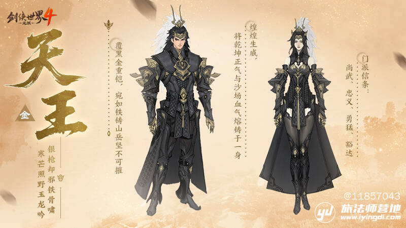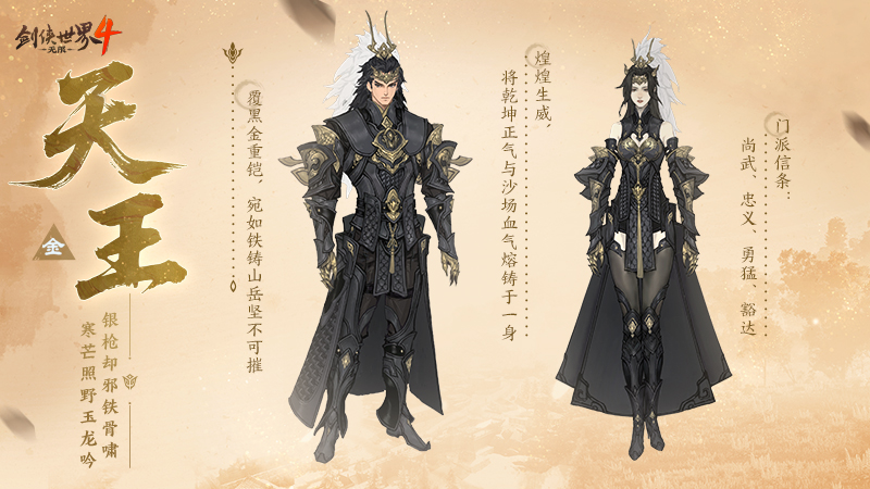 天王源自洞庭义军,以侠义立派,在江湖中自成一派。由于出身军伍,天王大多以枪盾造型行走江湖。门派装束充满铁血质感,暗金与墨黑的主色调既呼应五行之“金”。甲胄形制考究,仿照“步人甲”的多层次结构,以皮革与金属拼接,护住肩、胸、腹等要害。甲缝间缀以龙鳞纹样,既符合宋代美学,更暗合“飞龙在天”之势。弟子多束发冠、梳高马尾,配以金属额饰,尽显英武之气。