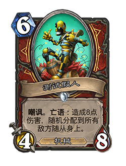 - 旧:嘲讽。亡语:造成8点伤害,随机分配到所有敌人身上。