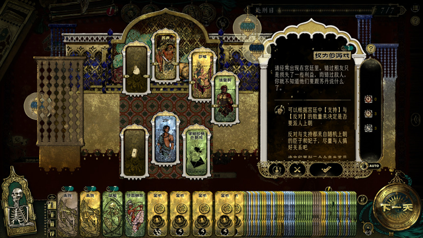在《苏丹的游戏》中,你将扮演一位被苏丹选中的臣子,踏入这场充满权谋、欲望与道德困境的奇幻世界。你必须在七日的期限中,不断抽取并完成“苏丹卡”所赋予的疯狂任务——沉溺纵欲、挥霍奢靡,冒险征服、血腥杀戮。一旦失败便会身首异处。