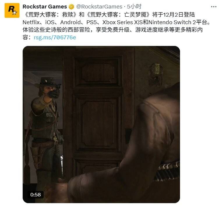 R星今日在社交媒体上宣布将于12月2日在PlayStation 5、Xbox Series、Switch 2以及通过网飞登陆的iOS和Android平台推出《荒野大镖客:救赎》。而拥有PlayStation 4、Switch版本或Xbox One向后兼容数字版的用户可免费升级至新版本。