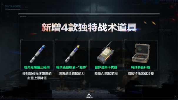 同时还新增了4款独特战术道具,解锁不同的战斗增益效果。这4款战术道具分别是普罗透斯干扰器——降低AI索敌距离;特殊装备补给——大幅缩短技能冷却;哈夫克脑机液-“超体”——增强危险感知能力;哈夫克端脑止疼剂——抑制部位损坏带来的血量上限降低。