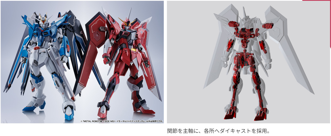 『機動戦士ガンダムSEED FREEDOM』よりイモータルジャスティスガンダムがMETAL ROBOT魂で登場!関節各部にダイキャストを使用。ダイキャストパーツにはメッキが施され、高級感を演出。