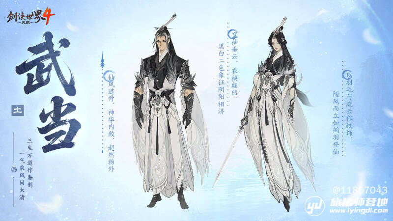 武当奉“道心、太极、清净”为信条,弟子自入门起,便诵读老庄,涵养道心,主张清静无为,淡泊宁静。门中弟子皆以剑为门派武器,飘然绝尘亦有仙人之风姿,尽显超然物外之态。这份出尘之姿,在门派校服的细节中得以完美呈现,服装面料在光影间自然垂顺,流动如水;衣袂处羽毛装饰质感灵动,似要踏云乘风而去,将仙逸出尘的气质烘托得恰到好处。