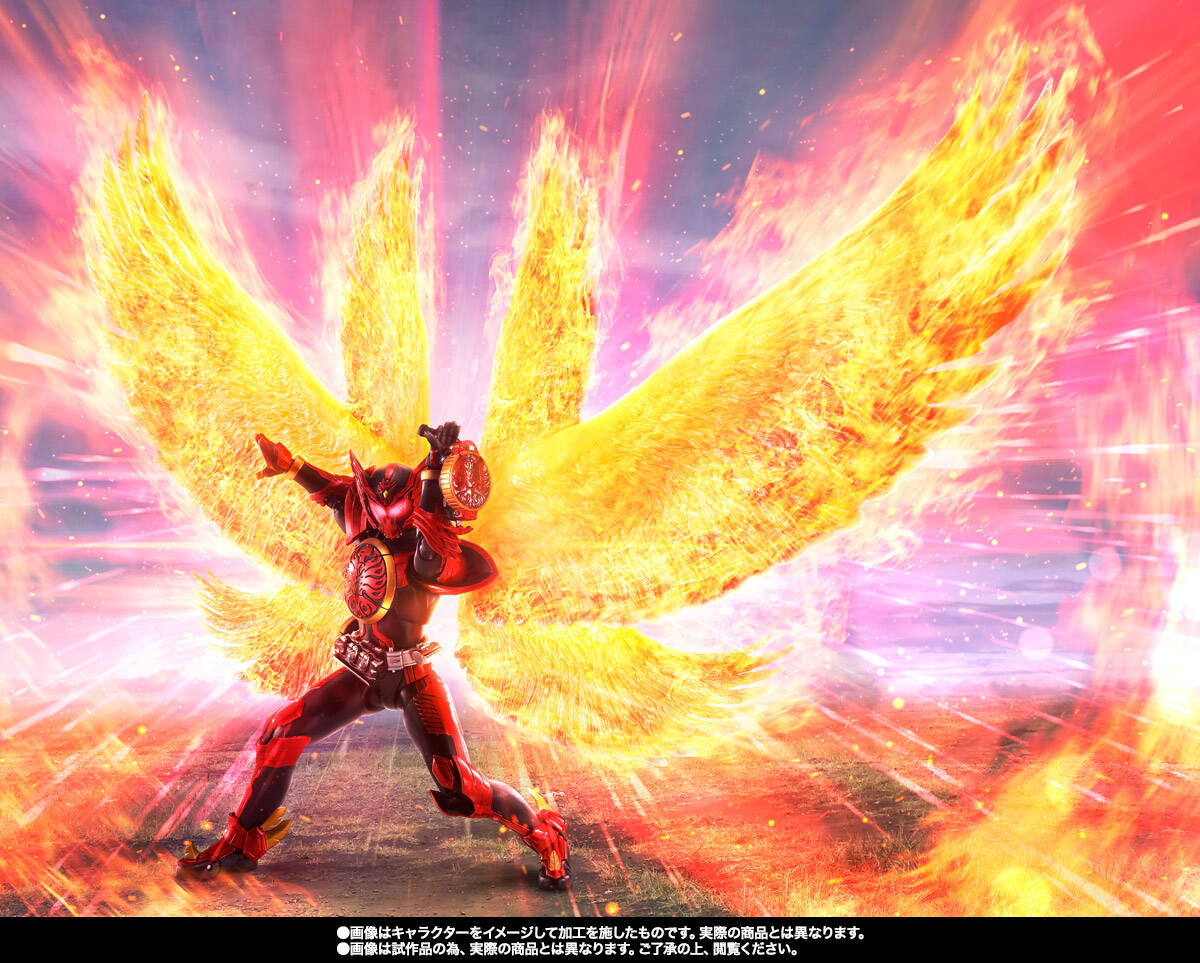 最終回のシーンをイメージして、メインのカラーリングである赤色をアレンジ。巨大な6枚羽を背中に装着可能で、アンクと共に戦う際のタジャドルコンボを再現!タジャスピナーに装填できる恐竜系メダルや、専用台座も付属。