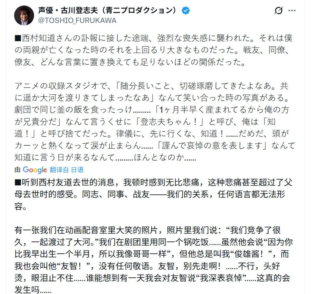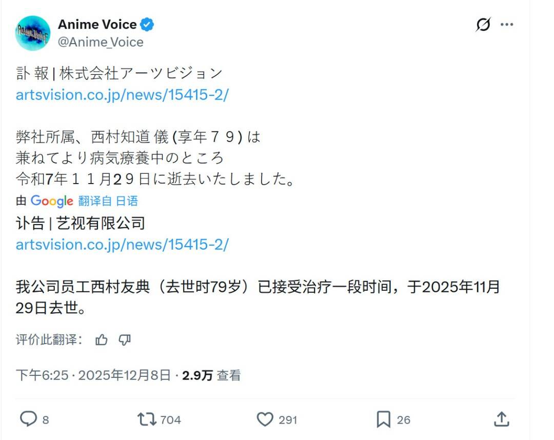 12月8日,声优经纪公司Arts Vision在其官网上宣布,因在《灌篮高手》中饰演安西教练而闻名的声优西村知道去世,享年79岁。