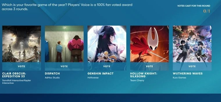 在进入最后决赛圈的五名选手中,有狂揽多个大奖的法国JRPG《光与影:33号远征队》、等待7年不负众望的《空洞骑士:丝之歌》、凭借独特叙事一经发售便爆火的《超英派遣中心》以及两位国产二次元抽卡游戏《原神》与《鸣潮》。前三款游戏凭借强大的口碑效应,在发售后数月仍牢牢吸引着玩家关注并收获如潮好评。