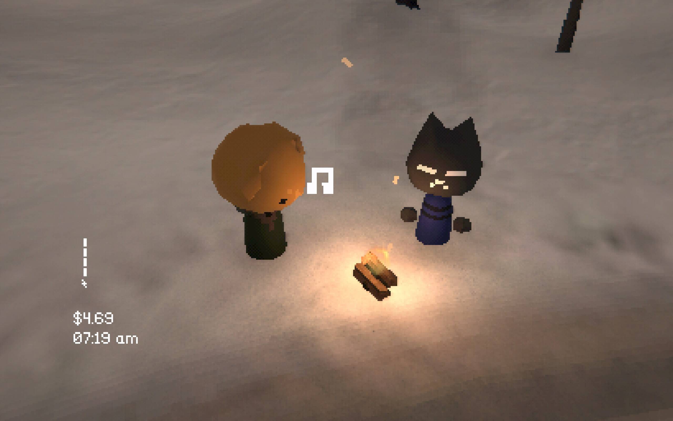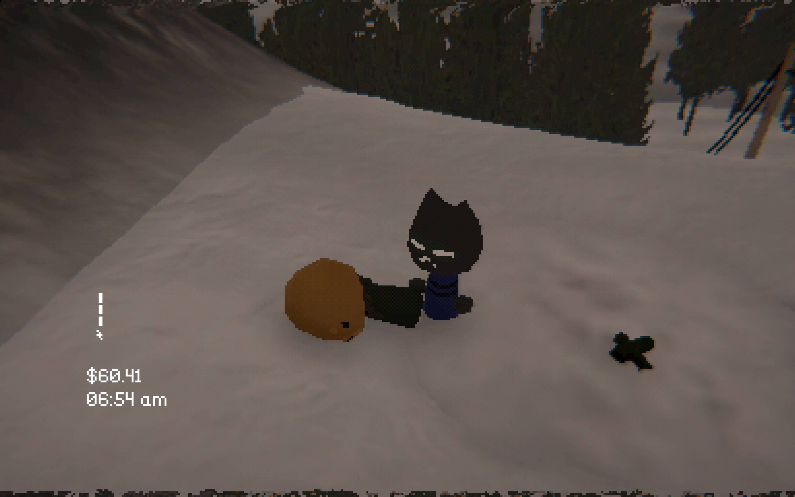 无论是封面,标题,刚进入游戏,一直到游戏结束,雪都没有缺席。在低多边形,或者说是像素的画面表现下,雪成为了棱角分明的镜头下一片铺开的白,沉在地上的,飘在天上的,把镜头完全带向一股静谧悲伤且纯净的氛围中去。