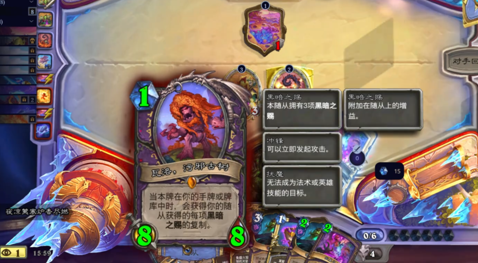 任务战:大优,现在战士抛弃了补水体系,打不还手,但是要注意的是,一是这种局复生优先级很高,仅次于冲锋风怒,即使你场面大优对面血也不厚,因为对手有可能一回合场解掉然后库库叠甲让你打不死,二是防一下对手的破坏,比如古树在手时尽可能让手里随从多起来(这也是影焰猎豹相较于狡诈拷问者的一大优势),尤其是斩杀前一回合,手牌尽可能拉满,同时古树明牌在牌库顶时,手牌数量小于7张或把树抽上来,以防鲍勃塞三币爆树,三是伊莉斯尽可能捏复制加攻,配合古树斩杀或冲锋怪抢血