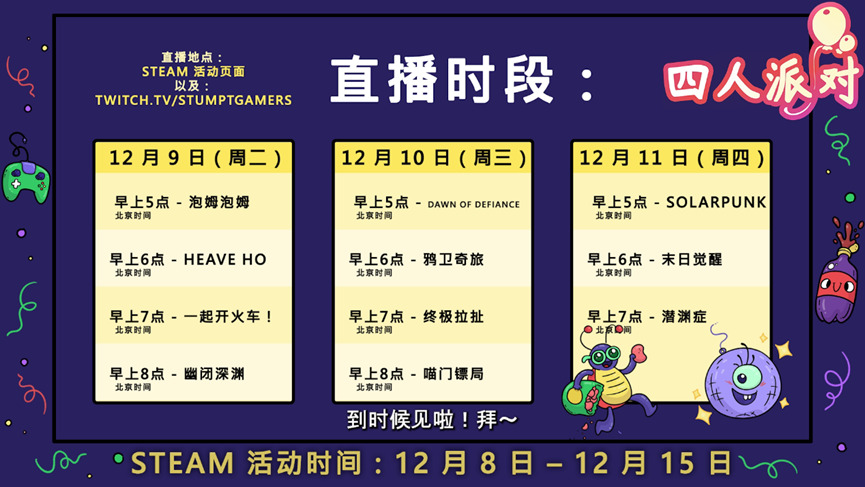 在折扣活动期间,StumptGamers 将于 12 月 8、9、10 日每日举办四小时直播(13:00–17:00 PST / 21:00–01:00 GMT),作为年度慈善活动 “Stumptmas” 的一部分。精选直播内容将同步展示在 Steam 活动页面上。所有直播片段的 VOD 将在活动期间全程保留。