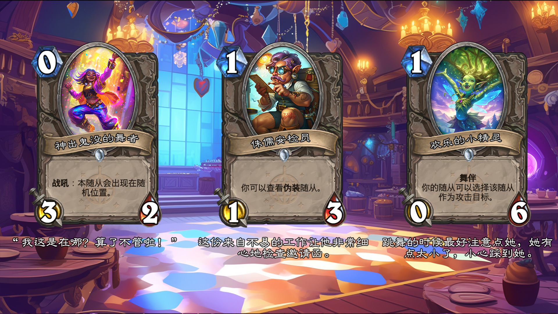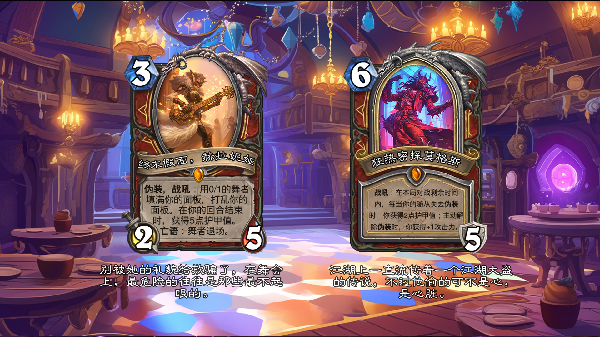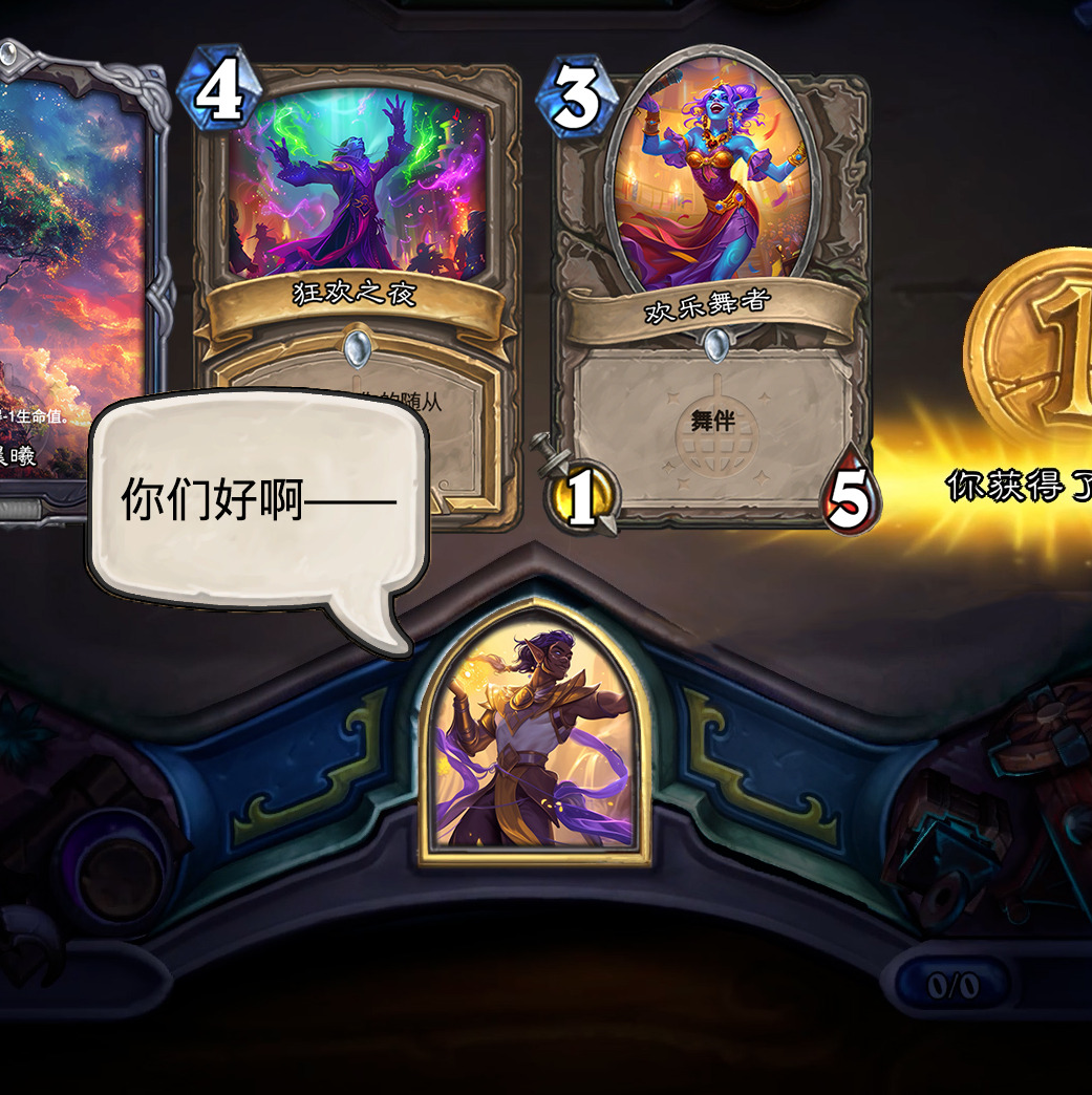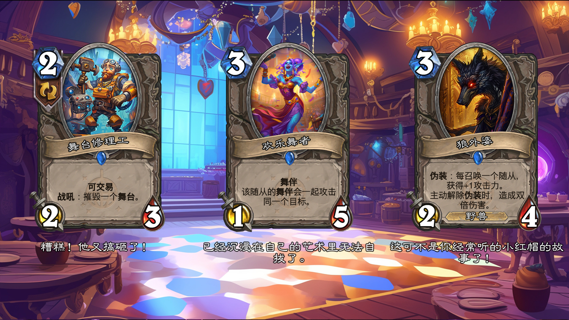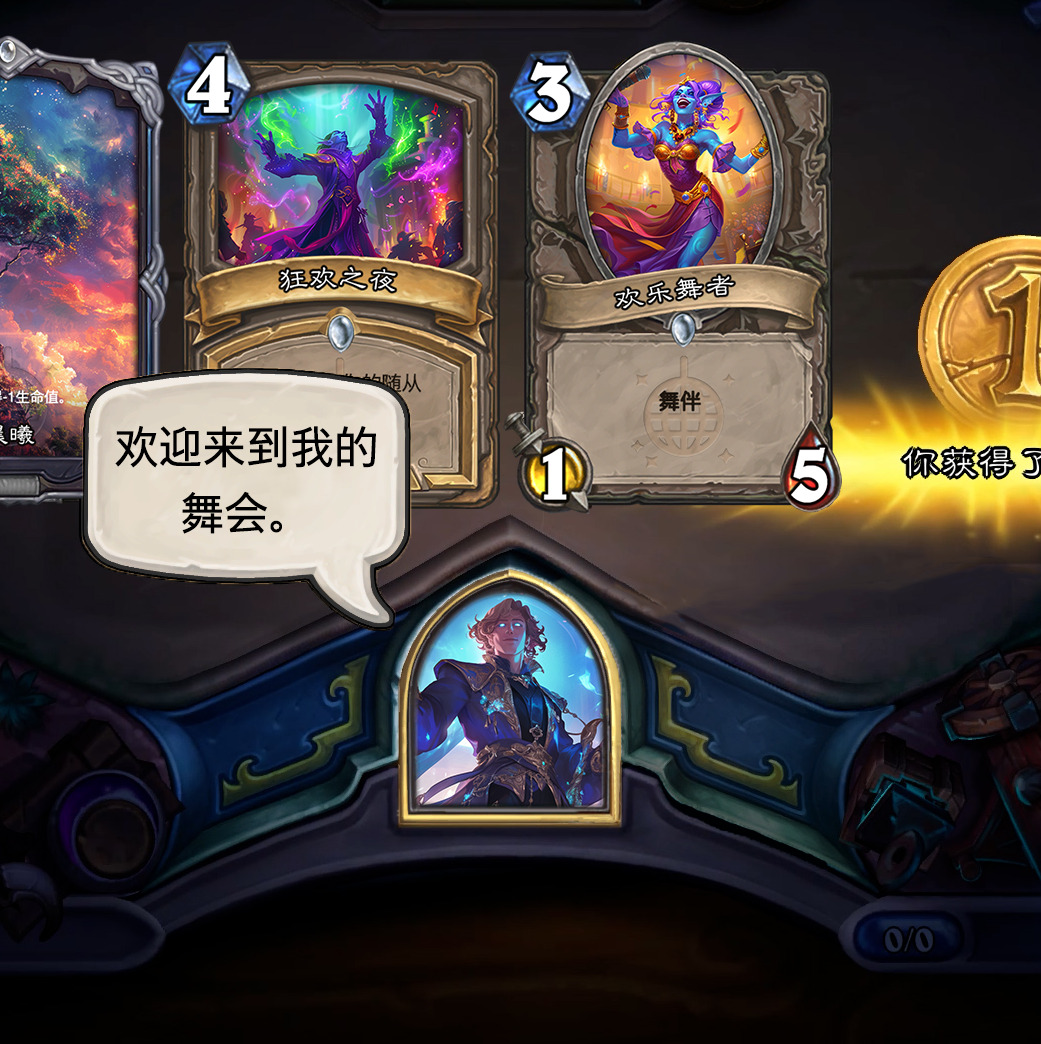 然后2019年的时候其实就尝试做过了,当时还是狗头人于地下世界拓展包,所以当时的背景设置就是狗头人不被邀请进入舞会,关键词为伪装hhh。舞台这个关键词其实有pvzh环境的思路。