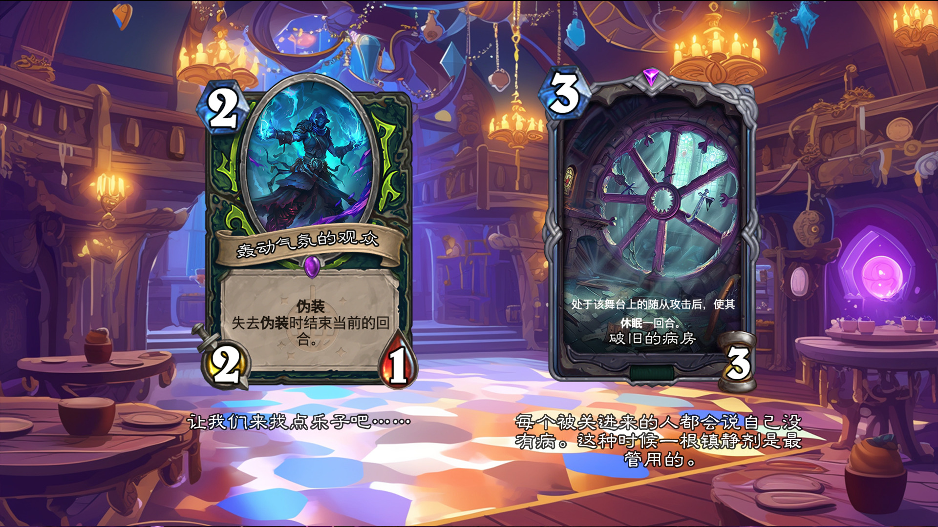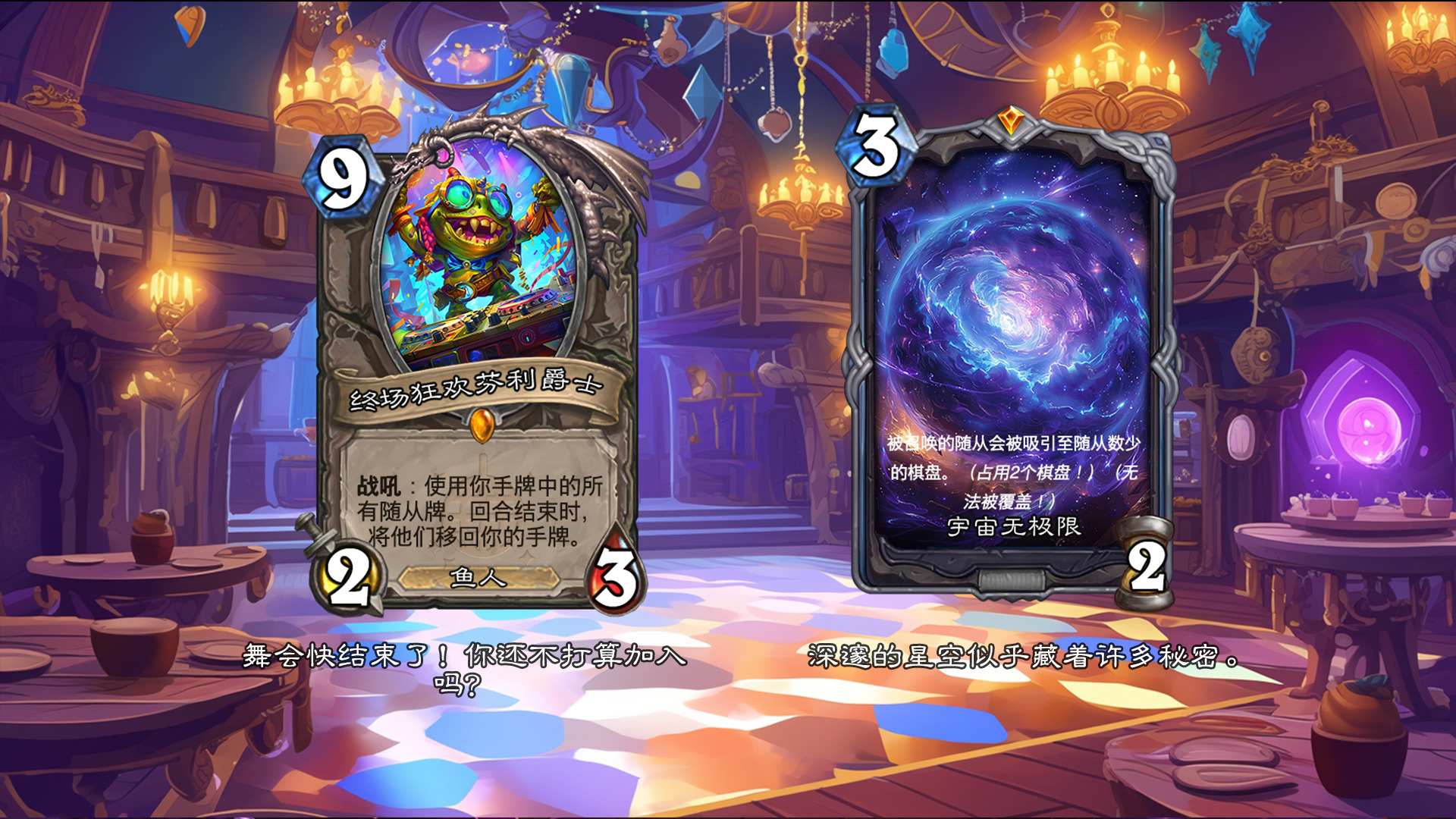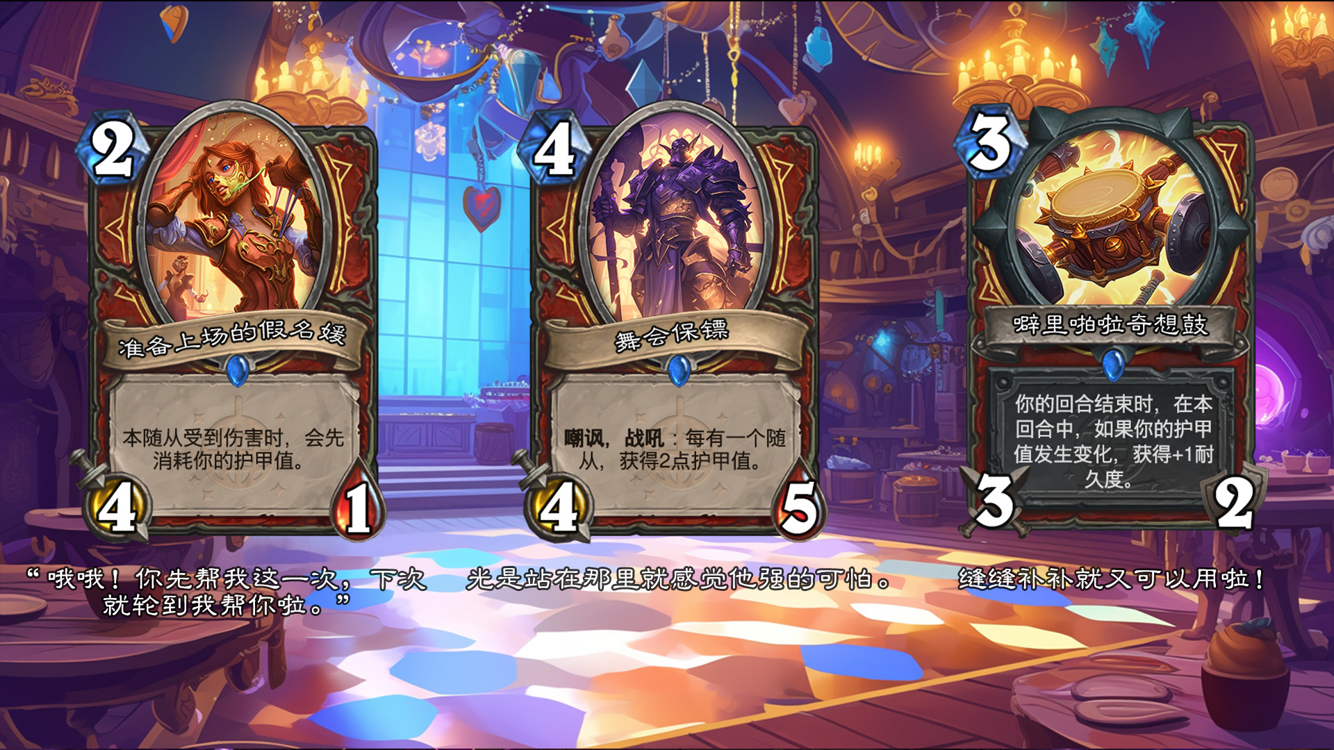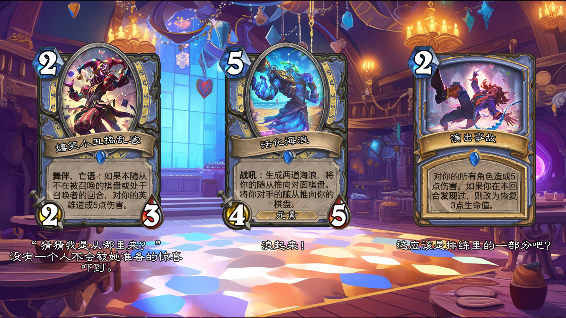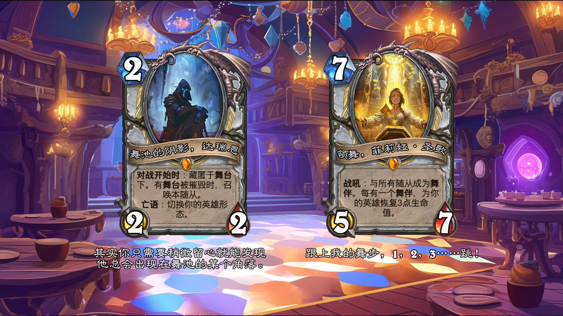 然后2019年的时候其实就尝试做过了,当时还是狗头人于地下世界拓展包,所以当时的背景设置就是狗头人不被邀请进入舞会,关键词为伪装hhh。舞台这个关键词其实有pvzh环境的思路。
