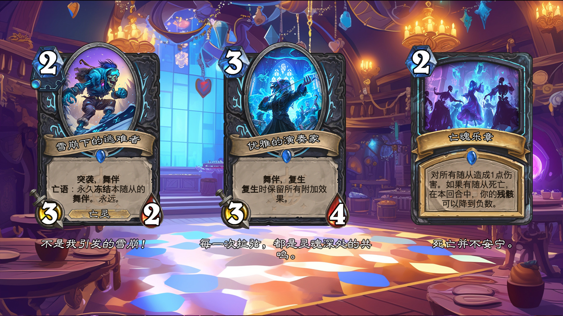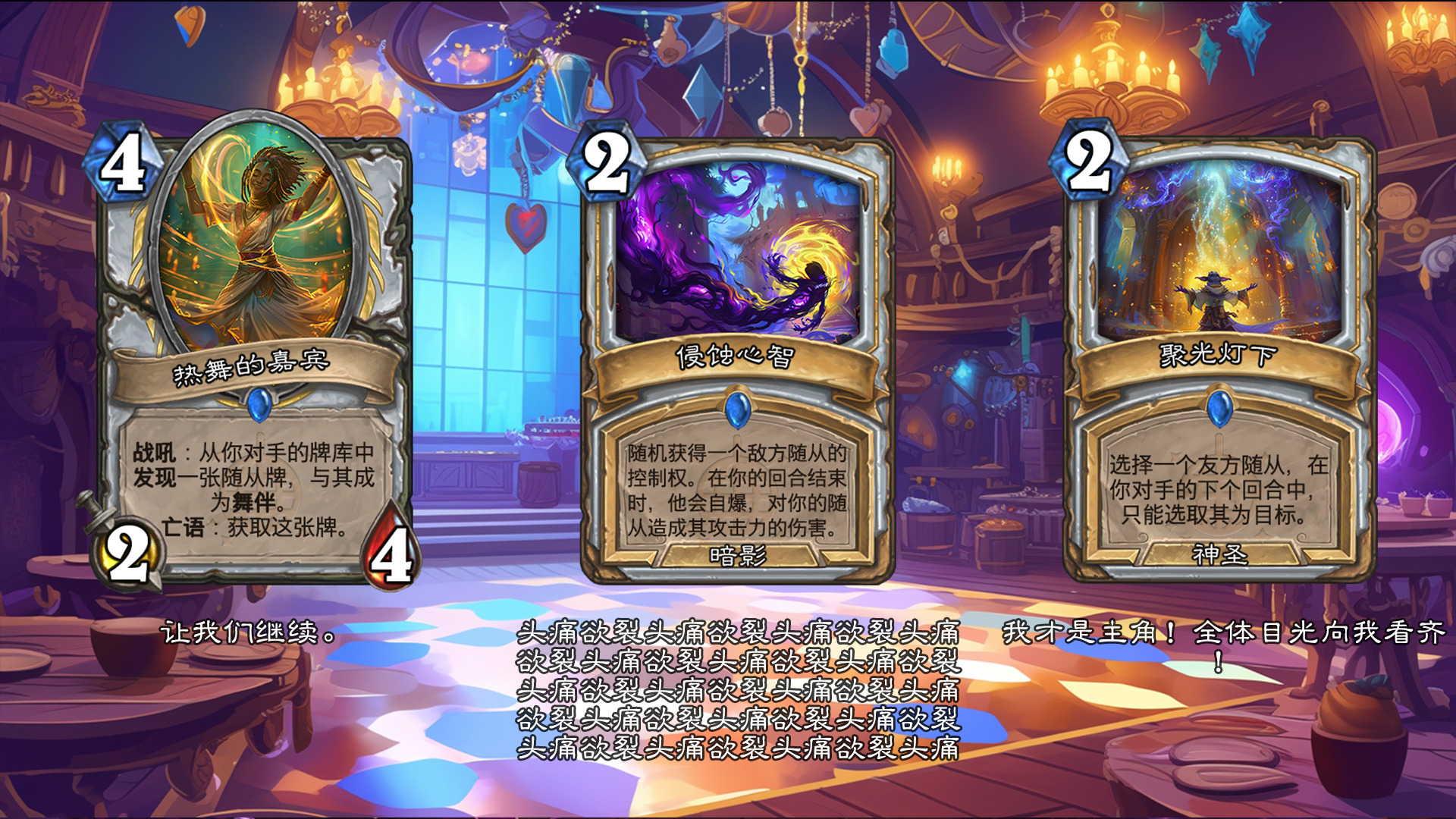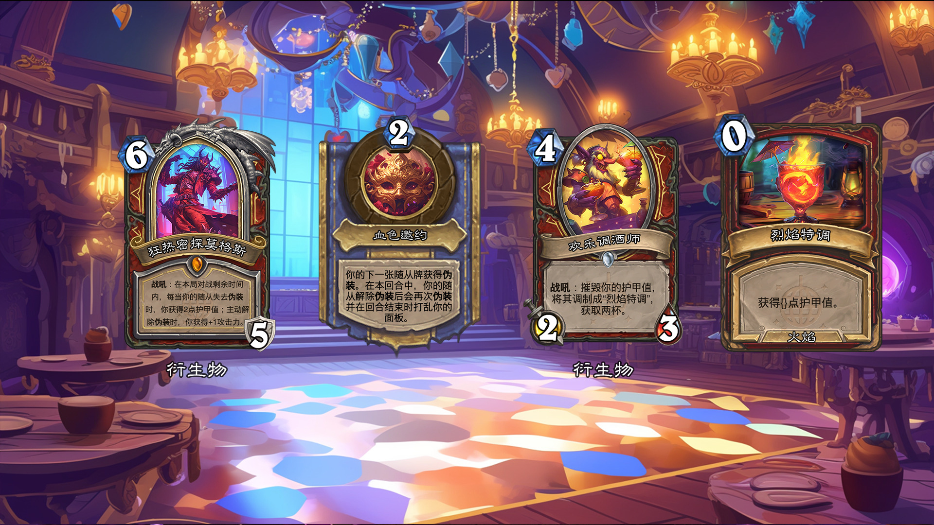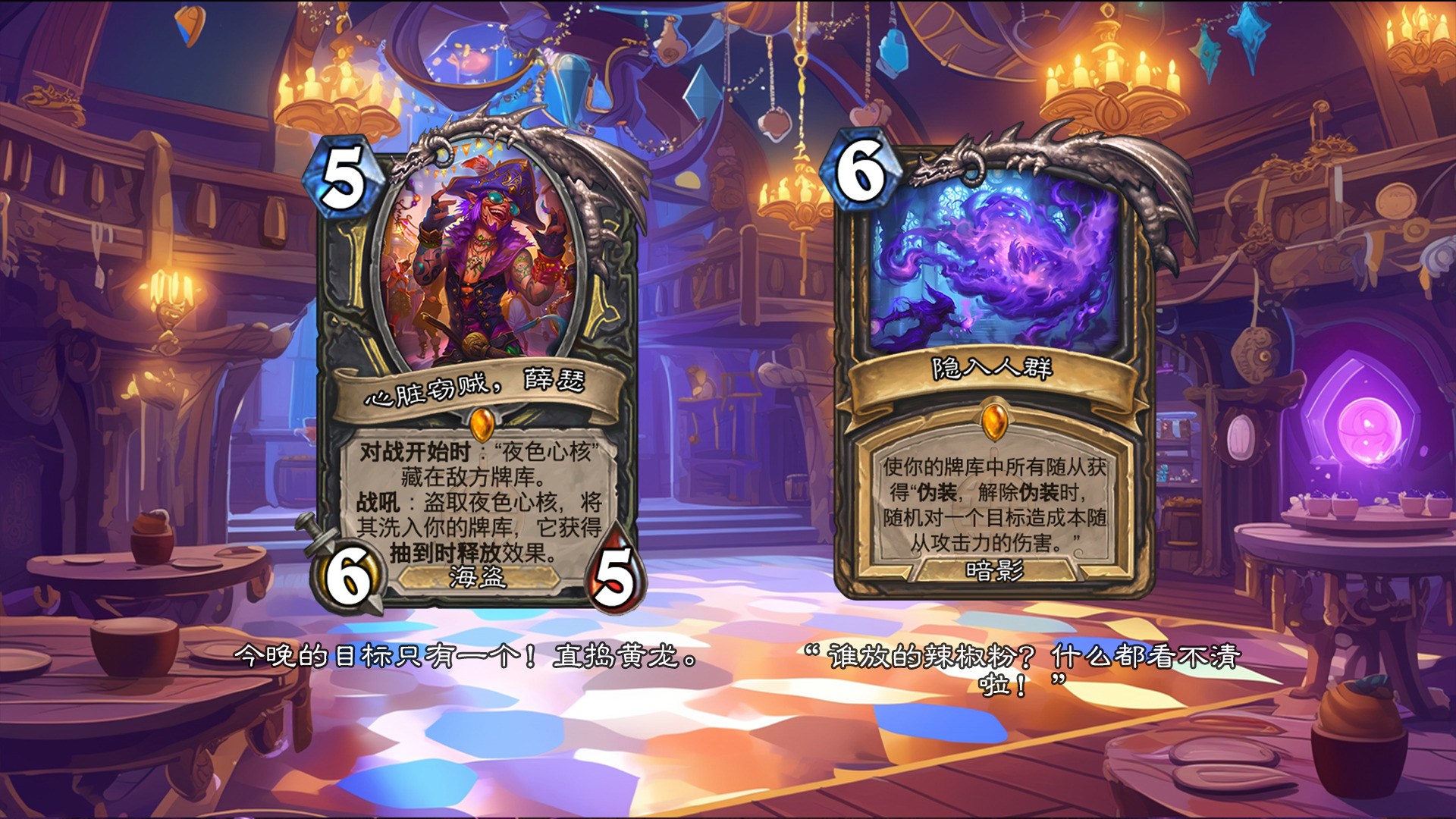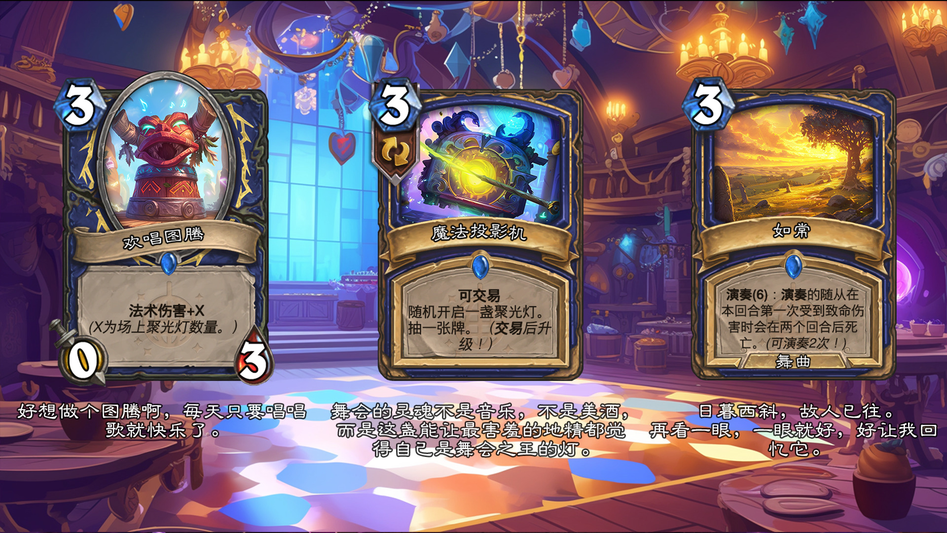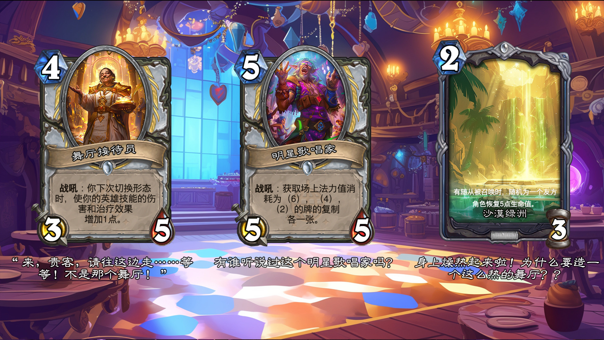 然后2019年的时候其实就尝试做过了,当时还是狗头人于地下世界拓展包,所以当时的背景设置就是狗头人不被邀请进入舞会,关键词为伪装hhh。舞台这个关键词其实有pvzh环境的思路。