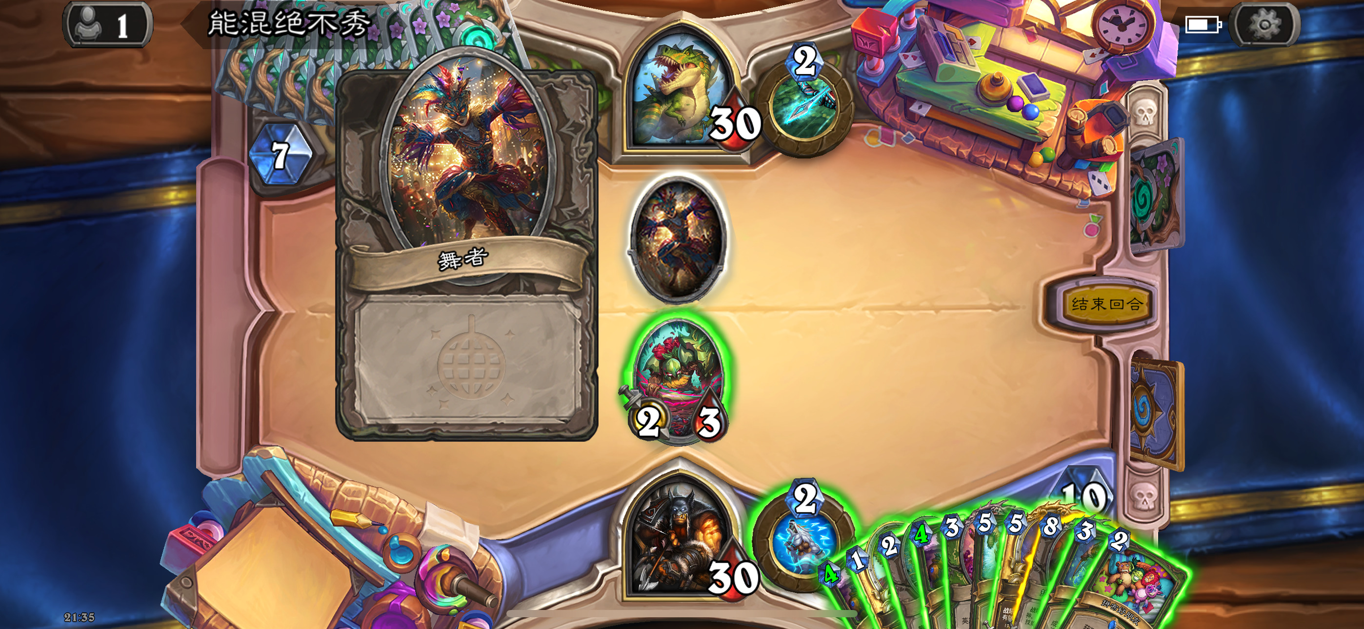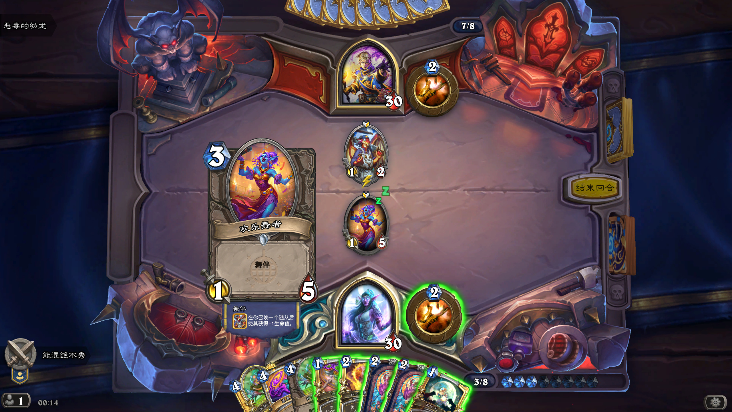 手牌中的舞者可以看得到法力值消耗,如果可以触发效果,边框会变黄,打出后恢复原样