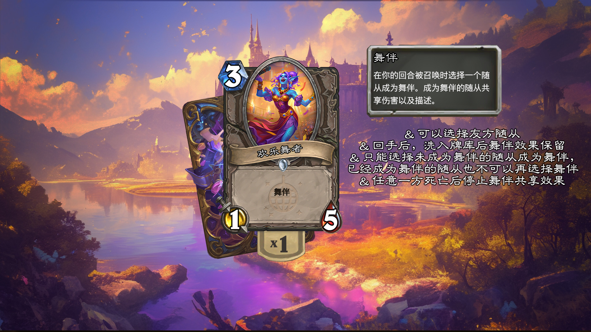 由于舞伴会共享伤害,死亡前一直保持着舞伴,所以如果是一次受到6点伤害(火球术),那么牌库里的随从也会受到6点伤害