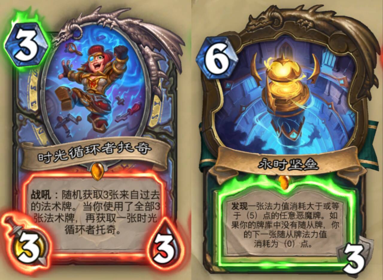 时光循环者托奇的两个痛点:原始费用法术不好打和部分法术打不出去直接卡死,这两个痛点都没解决但是变得灵活也算好事,三费就可以考虑带到愚人法里面玩玩;永时坚垒在狂野没减费的加强就是无所谓。