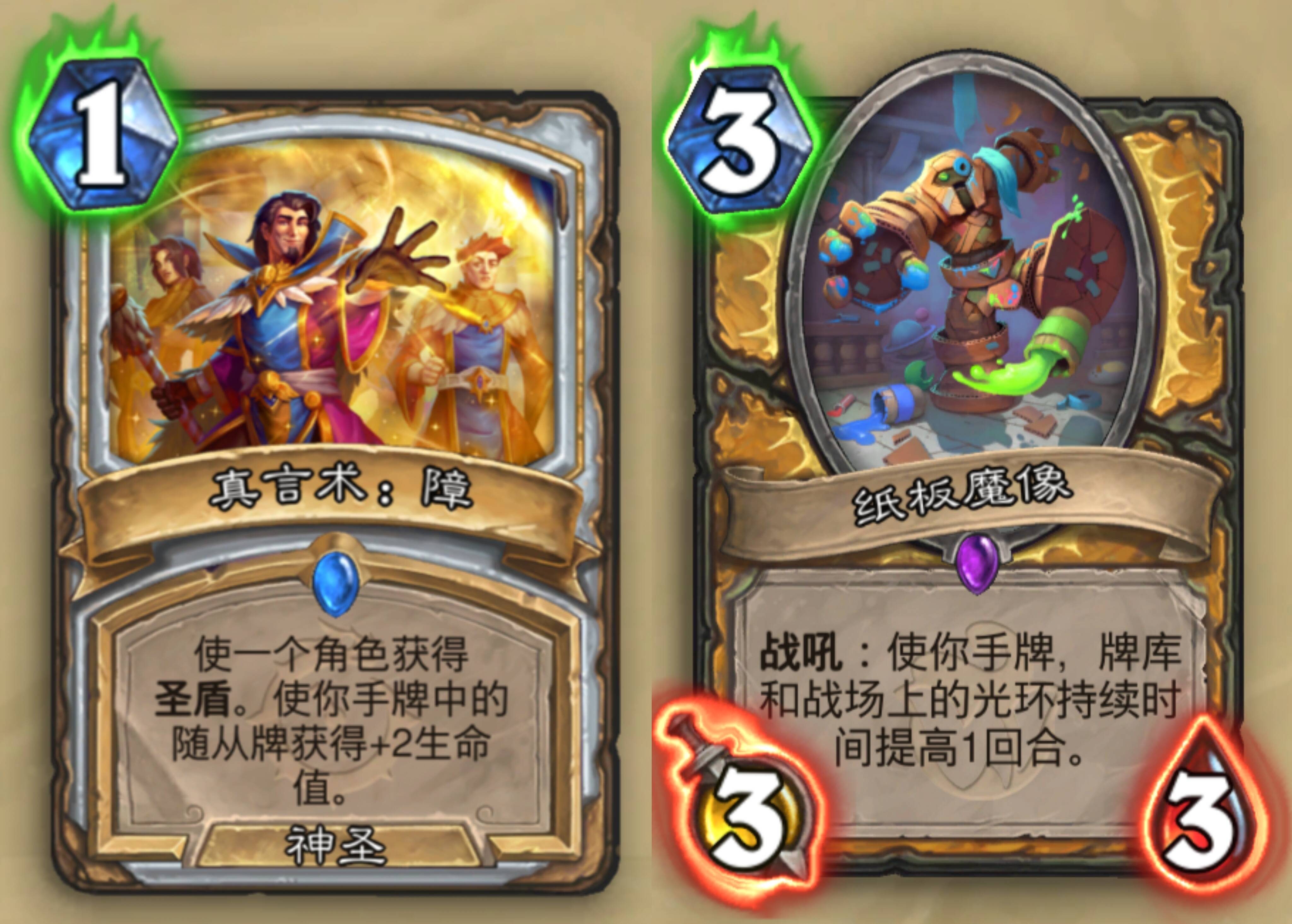 真言术:障和纸板魔像(均为-1费)加强不错,后续看看能否构筑配合(加入光暗任务牧、光环骑等)。
