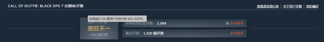 值得注意的是,该作目前简体中文好评率48%,为褒贬不一,共340篇评测,所有语言则为多半差评。
