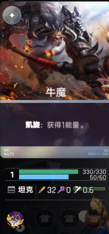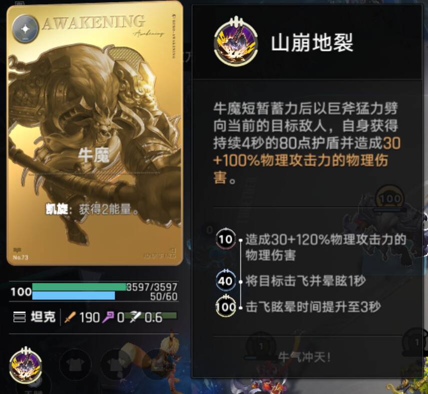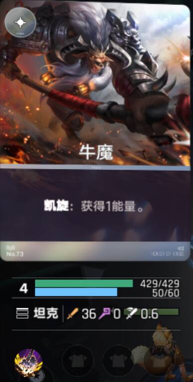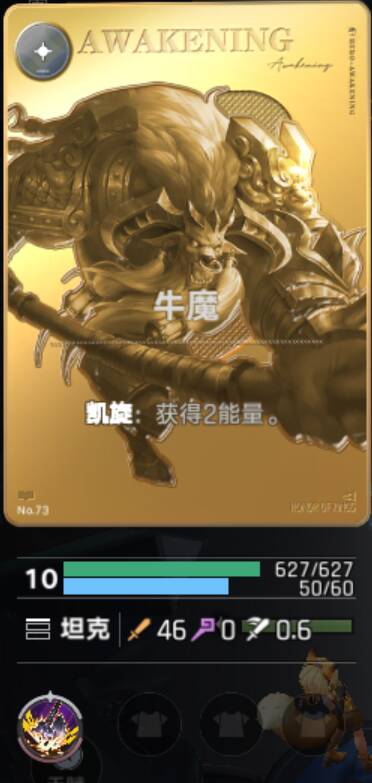 这是再丢了两张,共计四张后觉醒的牛魔,卡图变成了金色,效果也翻了倍,同时血量和攻击力也有提高,同时,每三次上场的合成都会获得一张锦囊牌,效果是让你在小于等于其等级的法术中选一个。