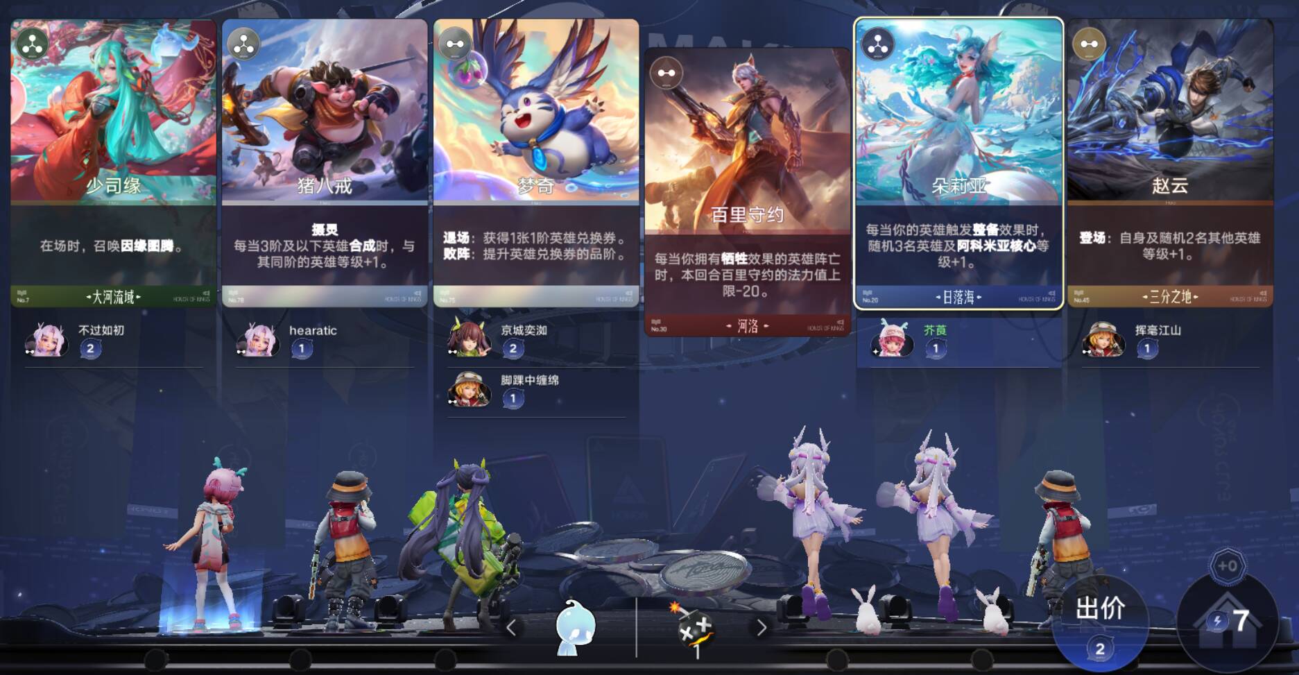 选秀:一个棋子+一个随机不可见散件≈铲铲选秀≈酒馆时光扭曲,区别在于其新的机制——拍卖制,初始最快选择的人需要出一块钱,后续每次跟注都需要加一块,我曾经为了一张我不需要的牌和人较劲到20元,然后光速去选了另一个没人要的,勾心斗角这一块。