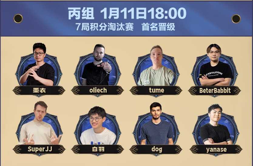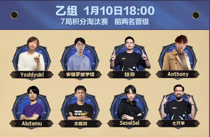 乙组(1月10日18:00)包括Yoshiyuki、安德罗妮学徒、狂帝