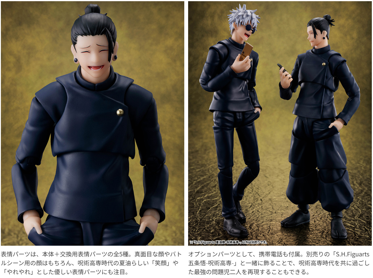 TVアニメ2期『呪術廻戦』「懐玉・玉折」より、呪術高専時代の夏油傑がS.H.Figuartsに登場!表情パーツが4種付属しており、高専時代の夏油傑の様々な姿が再現可能。オプションパーツとして、携帯電話も付属。