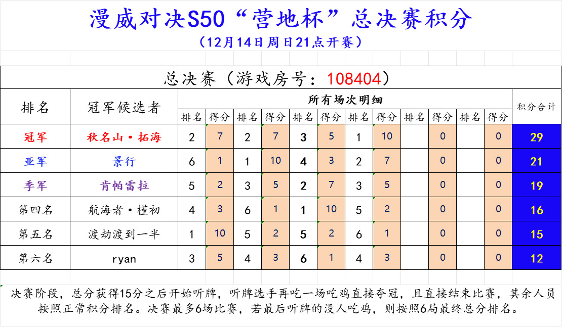 决赛阶段,总分获得15分之后开始听牌,听牌选手再吃一场吃鸡直接夺冠,且直接结束比赛,其余人员按照正常积分排名。决赛最多6场比赛,若最后听牌的没人吃鸡,则按照6局最终总分排名。