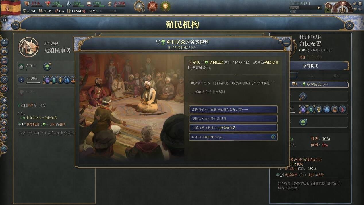 DLC大幅增强了政治斗争的“可操作性”。新增的“谈判”系统允许玩家在主要利益集团(如地主、军队、教会)乃至外国势力之间进行非公开的协议交换。你可以通过秘密承诺关税优惠换取工业家的支持,也可以用未来的殖民地特权换取军队在议会中的关键一票。这些操作都能间接影响法律的展开,为通过激进**或维持危险平衡创造可能。