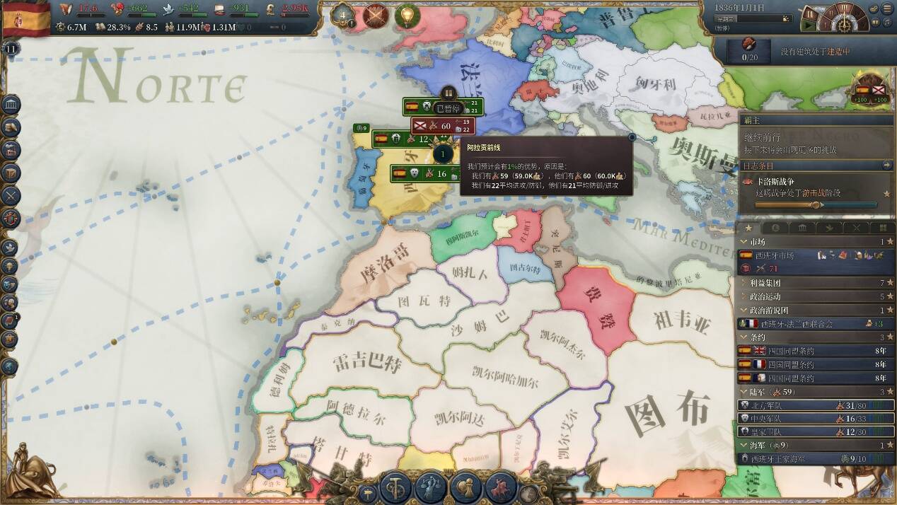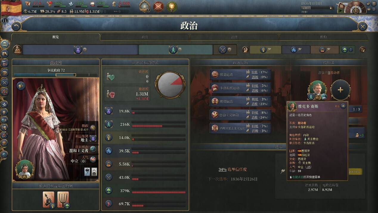 《伊比利亚暮光》的故事背景设定在1836年剧本前后,此时的西班牙深陷王位继承冲突(卡洛斯战争)、帝国摇摇欲坠,葡萄牙则面临君主立宪的动荡与巴**立后的国力衰减。DLC通过大量的事件与日记条目,将这些历史转折点编织为可互动、可选择的叙事网络。玩家不仅要在宏观上推动国家现代化,通过全新的战争阶段和政治交易操作手段,在微观上介入政治暗流与军事行动的每一个阶段,体验帝国黄昏下,每项决策都充满妥协与代价的沉重感。本DLC的创新核心,集中体现为对政治与战争两大模块的新模块: