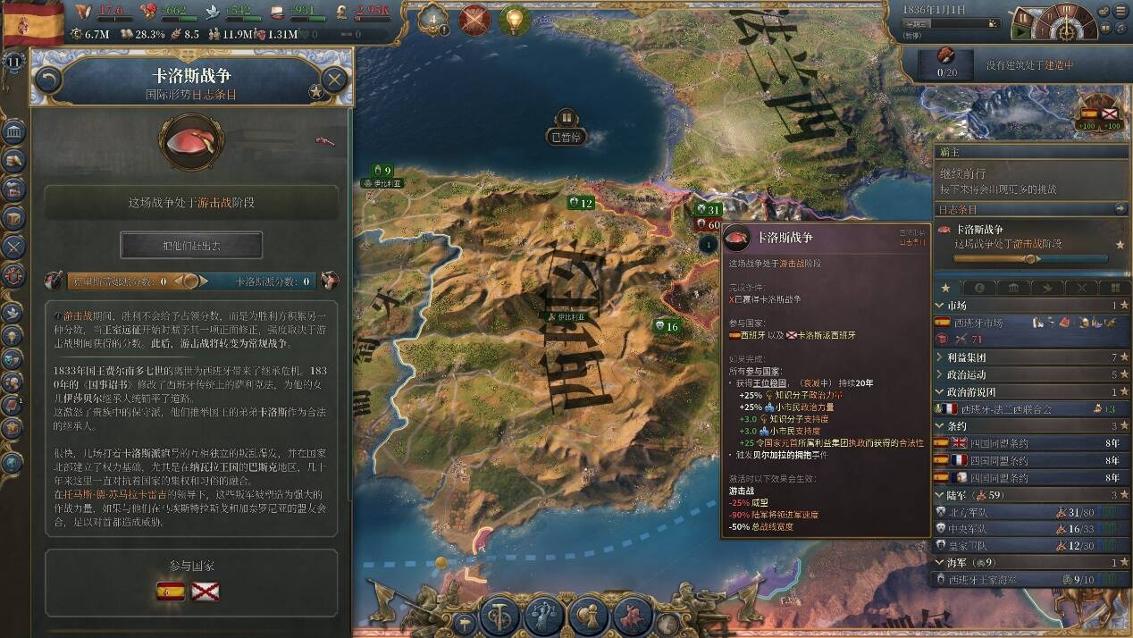 围绕卡洛斯派,游戏构建了从政治博弈到全面军事消耗的完整链条。玩家从开局就会陷入到内战的游击战之中,完美体现新战争系统的设计意图。