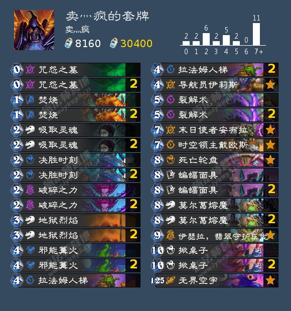 另外提一嘴这卡组可以把轮盘裂解术什么的都优化掉,带dk的3费冰冻海盗,面具复制然后直接7+7打otk,或者可以两个亡语都带灵活一些,不过我个人喜欢纯粹的叠就没带,个人感觉这样胜率会更高一些。
