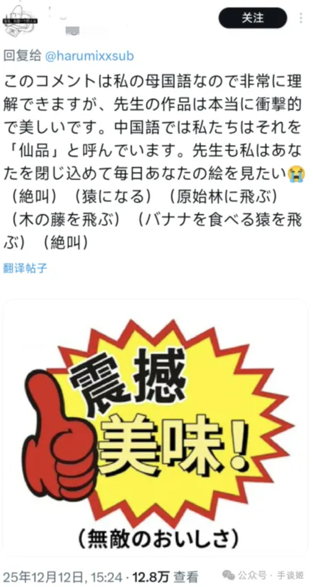“这条评论是我的母语,所以我完全能理解。老师您的作品真的极具冲击力、非常精美。在中文里,我们会把这样的作品称作‘仙品’。老师,我也想把您关起来,每天看您的画(尖叫)(变成猴子)(在原始森林里狂奔)(拿藤蔓荡秋千)(追着吃香蕉的猴子跑)(尖叫)”