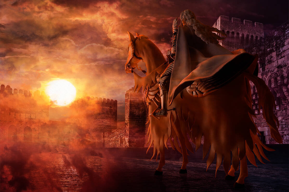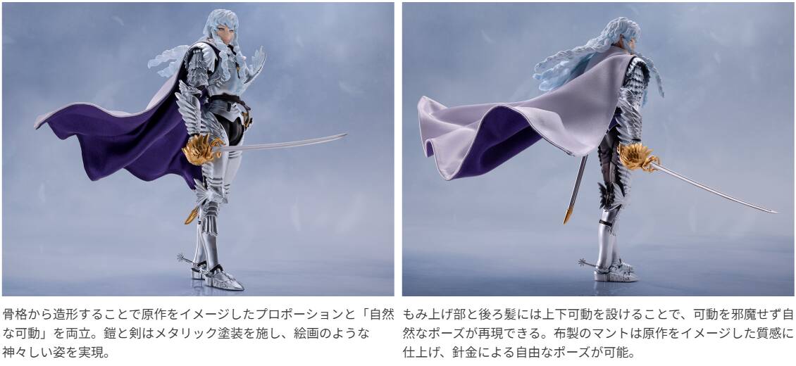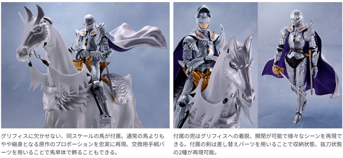 全世界で人気を誇るダークファンタジーの金字塔、『ベルセルク』より「新生・鷹の団」団長、グリフィス(光の鷹)が馬とセットの大ボリュームで登場。鎧や剣は豪華に彩色を施し、絵画のような神々しい姿をそのまま立体化。付属の兜はグリフィス本体への着脱、開閉が可能。