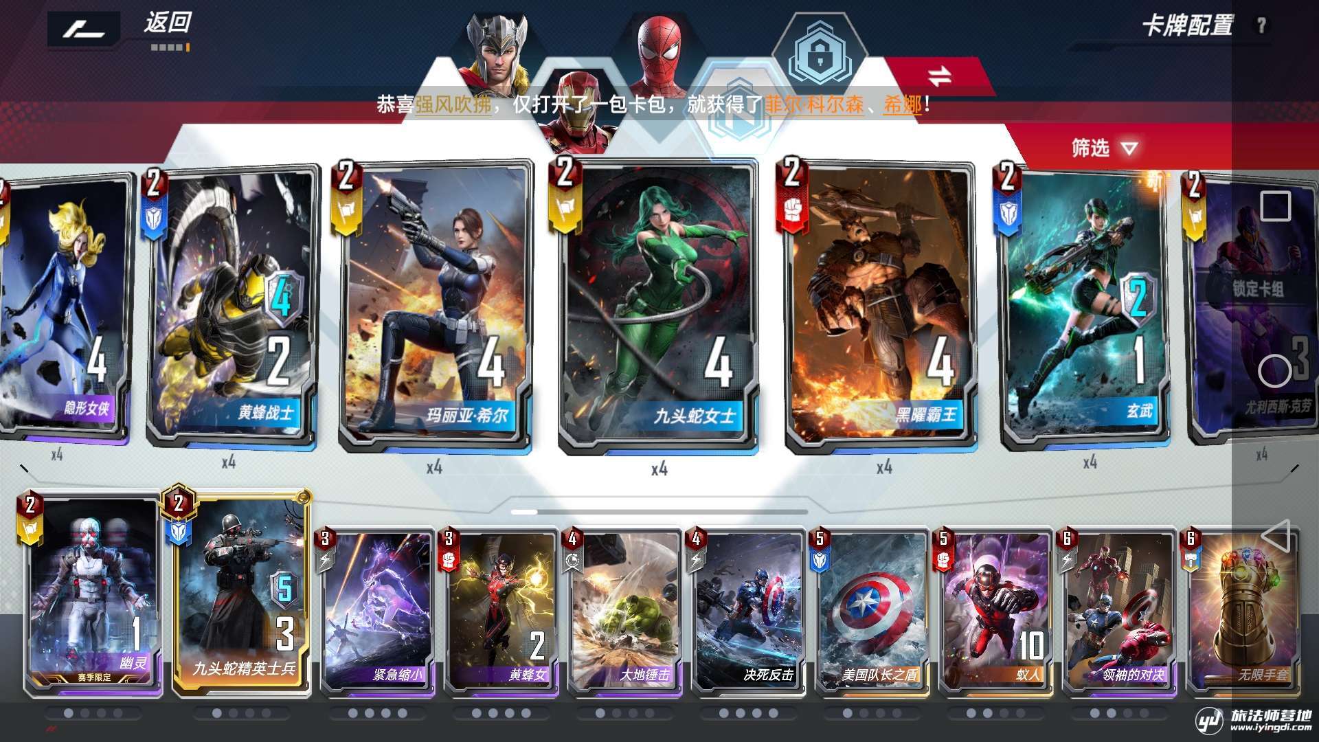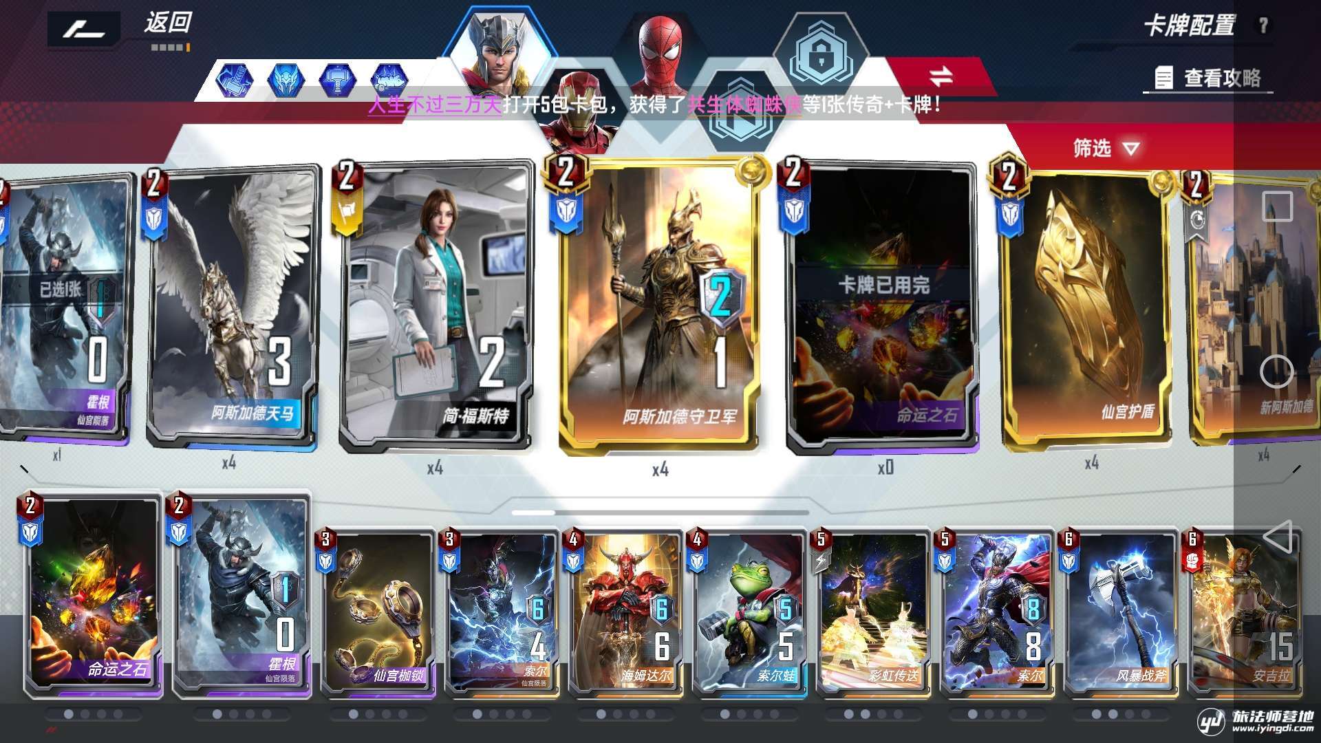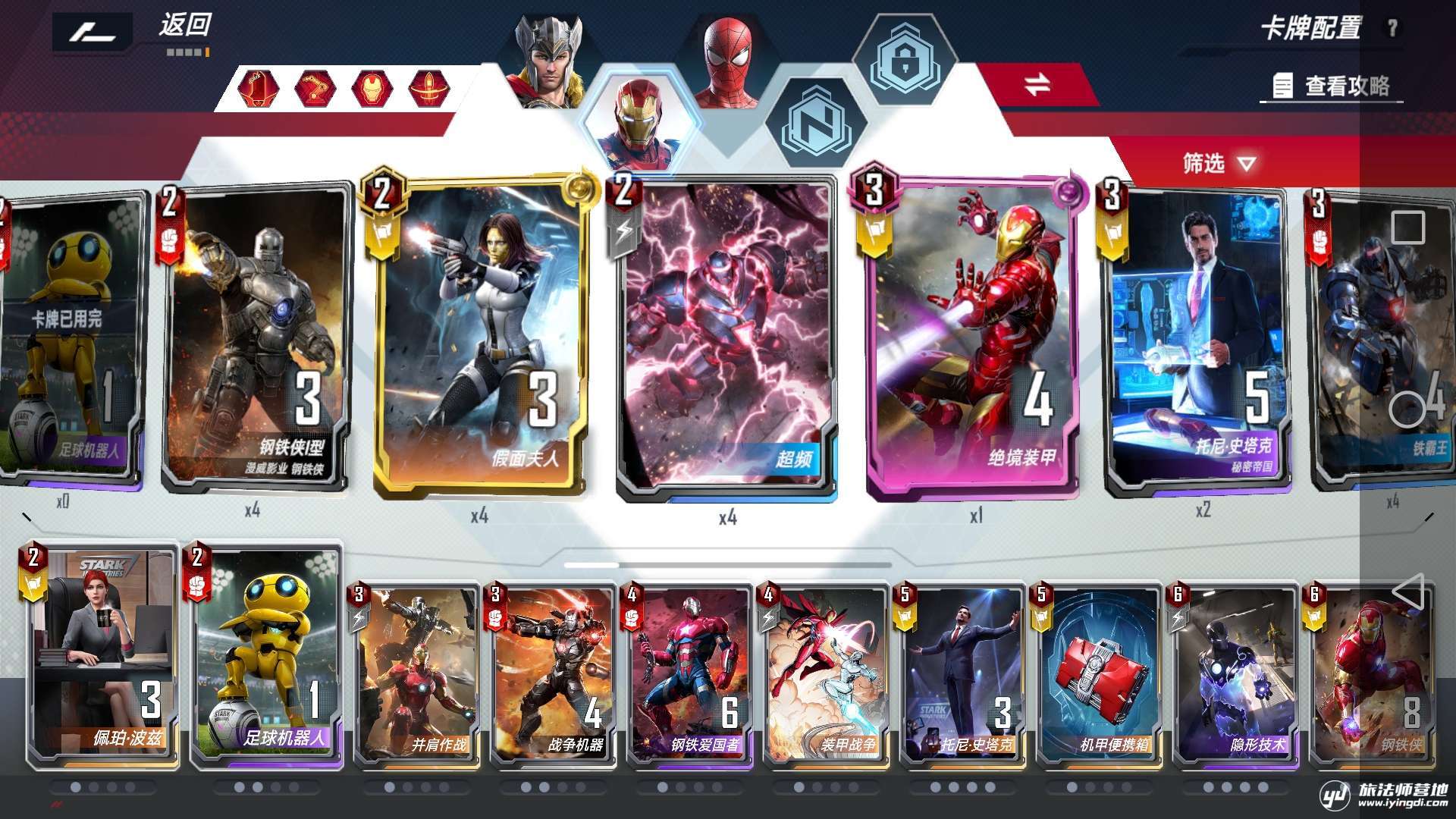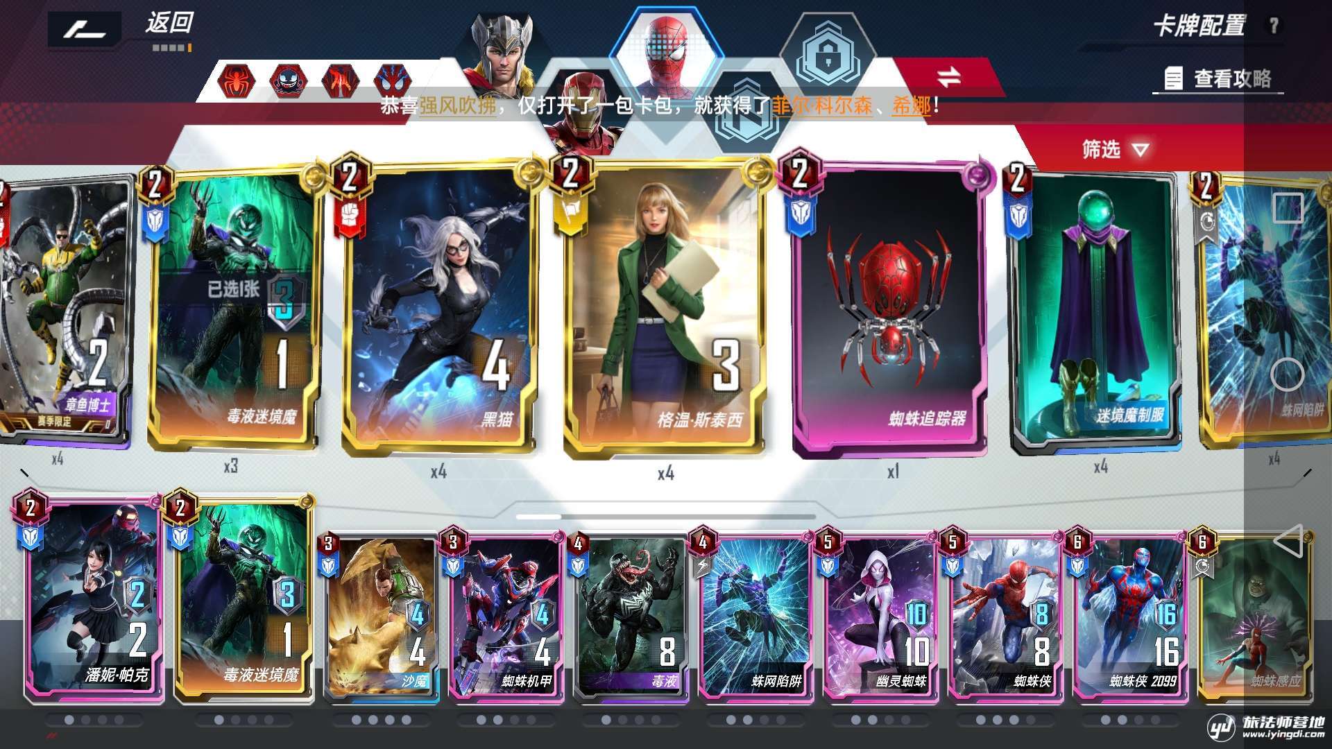 以下就是我所带的卡组配套:分别为索尔,钢铁侠和蜘蛛侠
