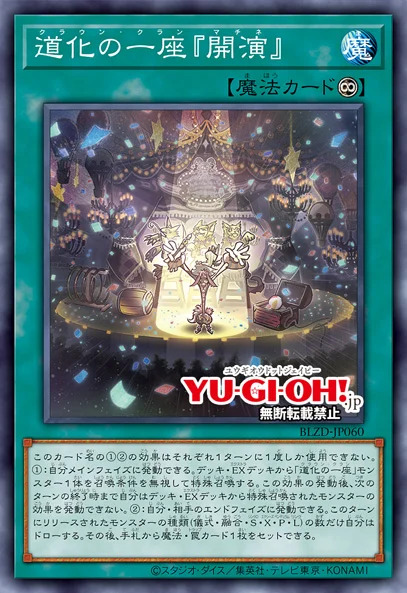这个卡名的①②的效果1回合各能使用1次。 ①:自己主要阶段才能发动。从卡组·额外卡组将1只「小丑戏帮」怪兽无视召唤条件特殊召唤。这个效果的发动后,直到下个回合的结束时自己不能将从卡组·额外卡组特殊召唤的怪兽的效果发动。 ②:自己·对手的结束阶段才能发动。自己从卡组抽出这个回合被解放的怪兽的种类(仪式·融合·同步·超量·灵摆·连接)的数量。那之后,可以从手牌将1张魔法·陷阱卡盖伏。