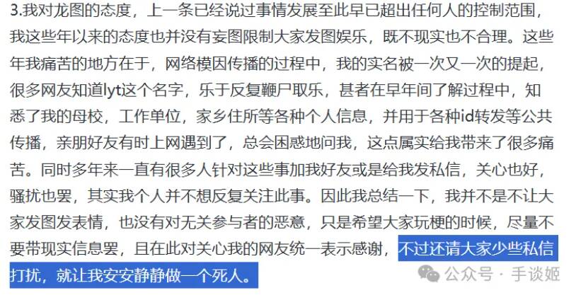 有网友问他对于现在龙图的看法,他表示,并不会阻止网友们玩龙图,也阻止不了,但是如果用他的肖像营利或者涉及到了他本人的三次元信息,还是希望大家多点点举报,至于B站私信他基本不会回复,按照他自己的说法——只想当个死人。