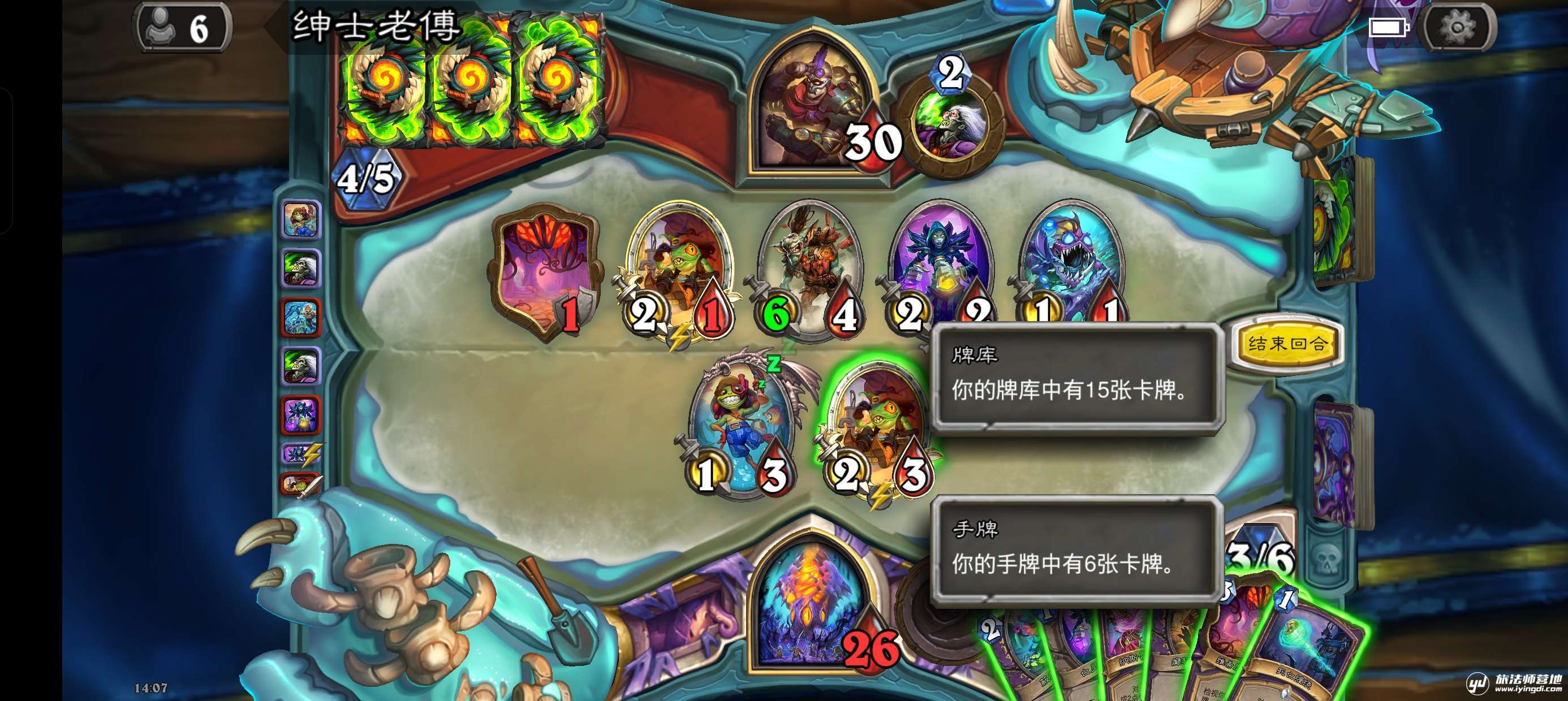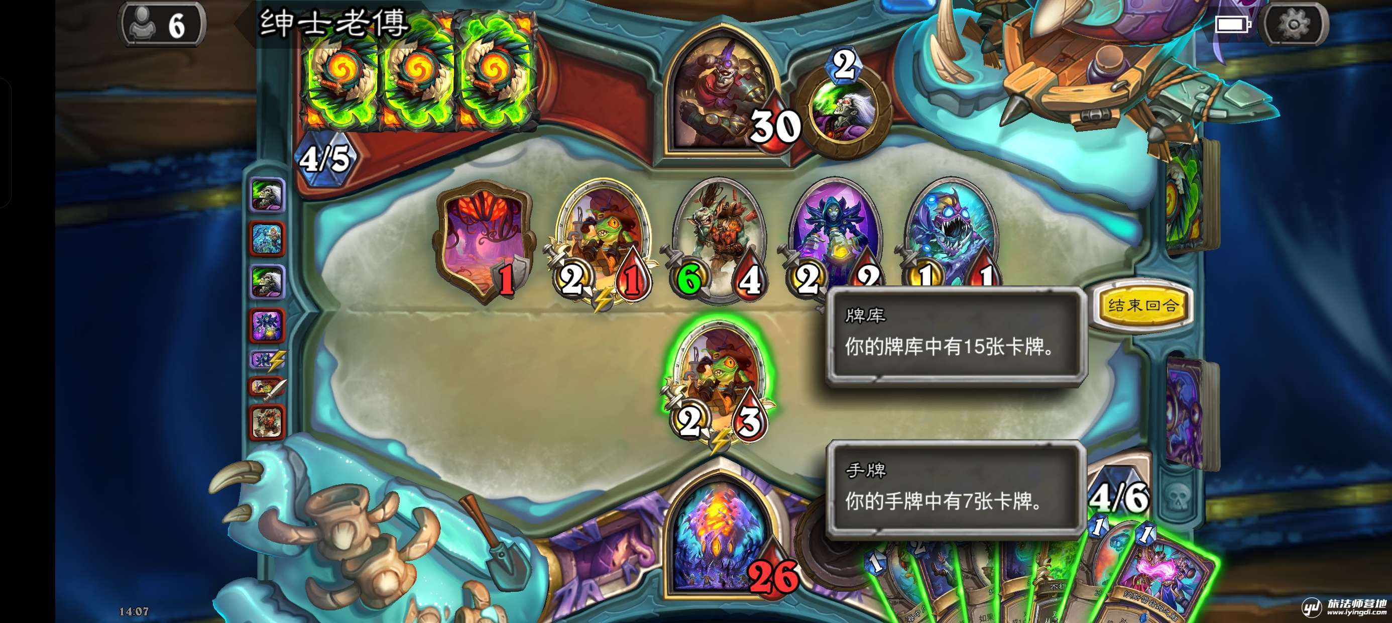 虽然有洗牌的动画,但是可以看到地精工兵记录值仍然大于6张卡牌