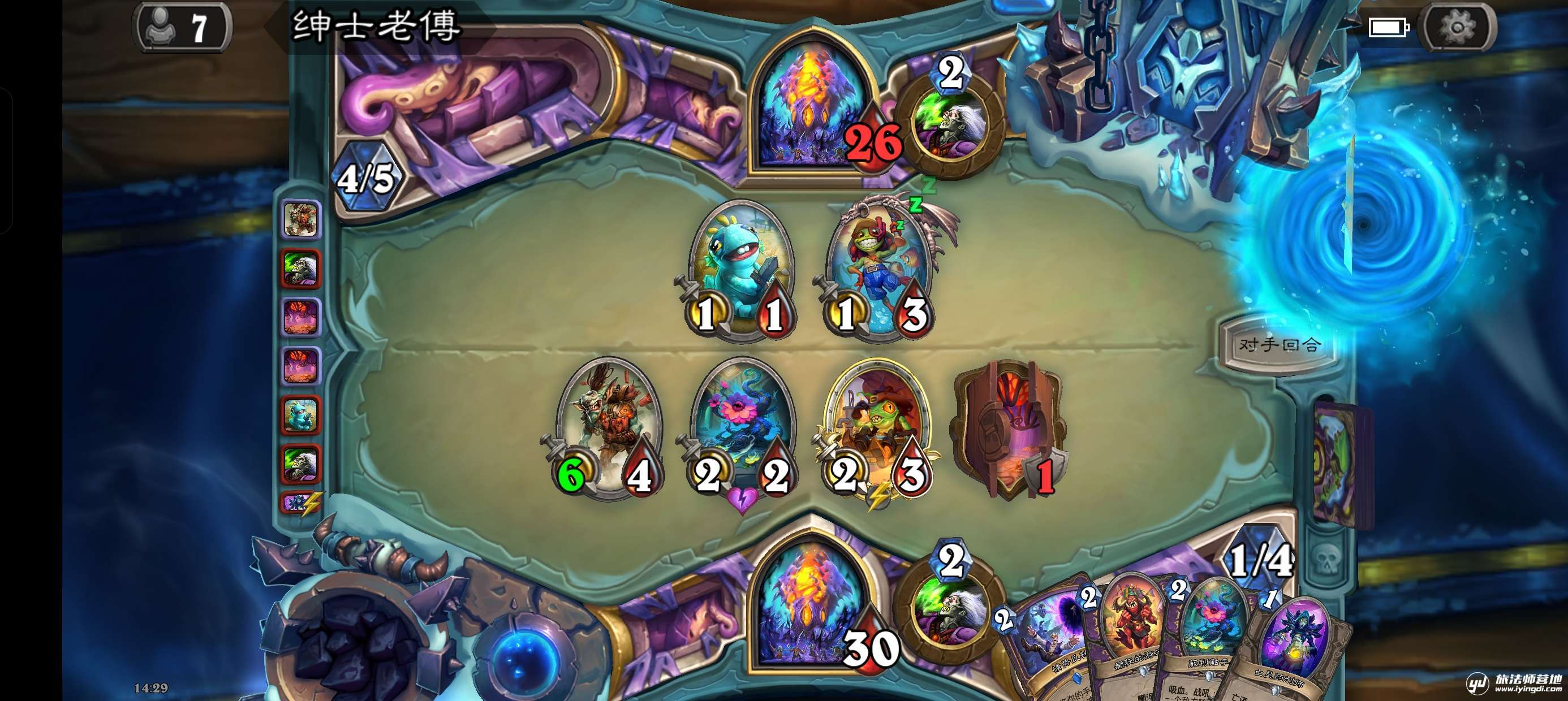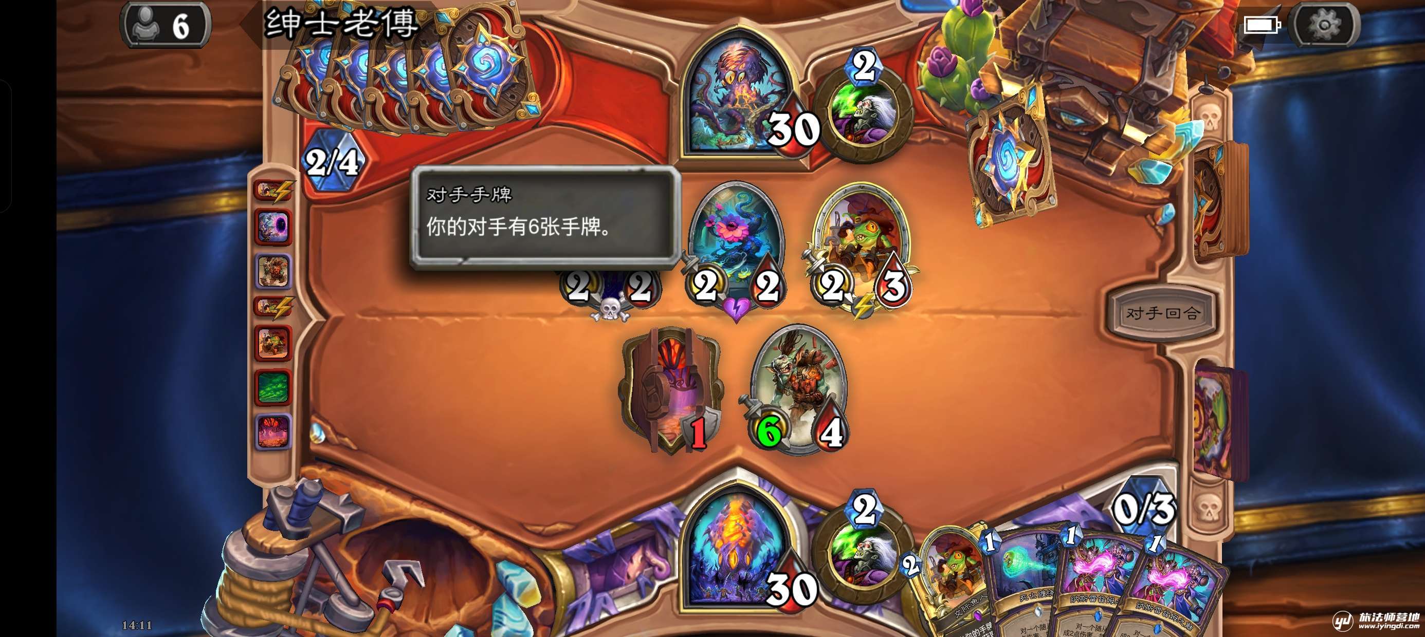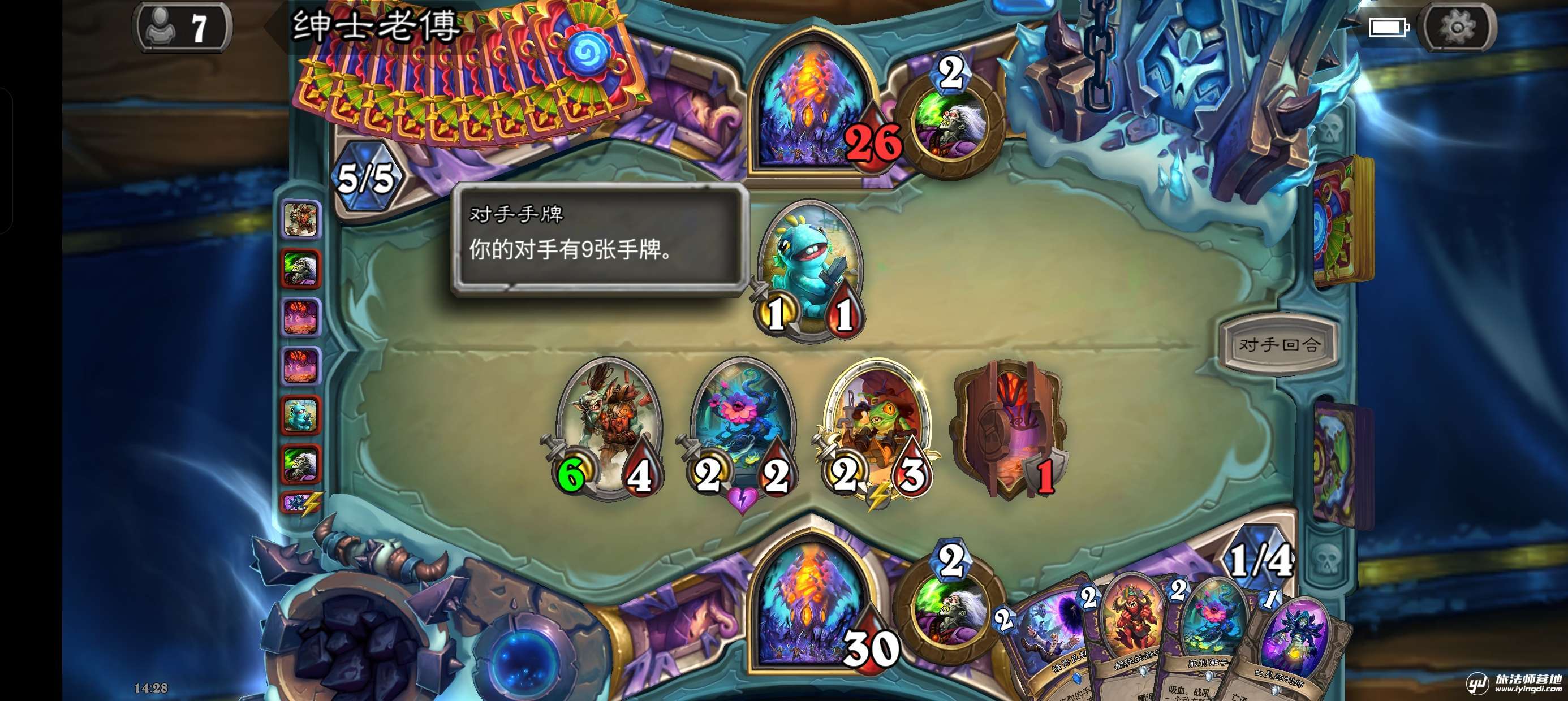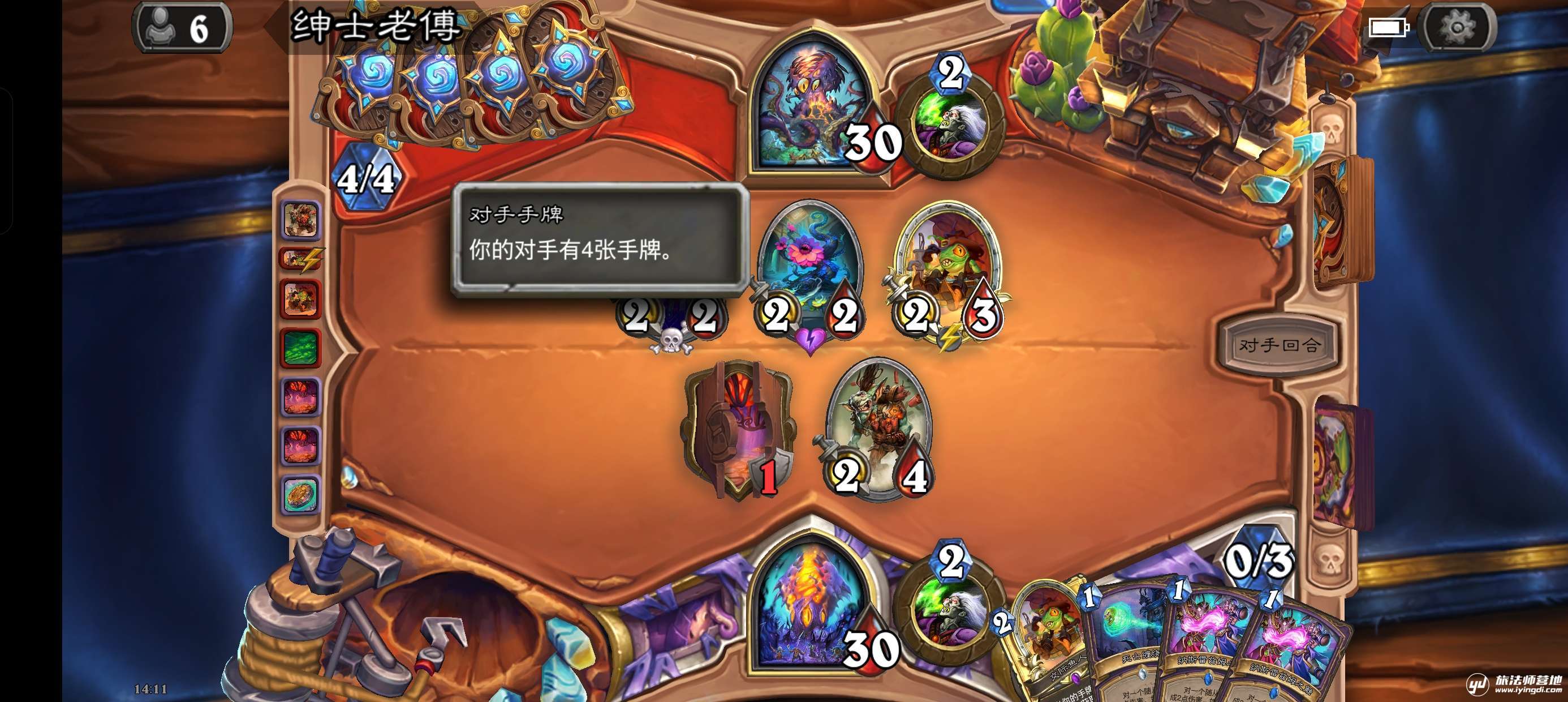 此时对手手牌数为4,打出情势反转