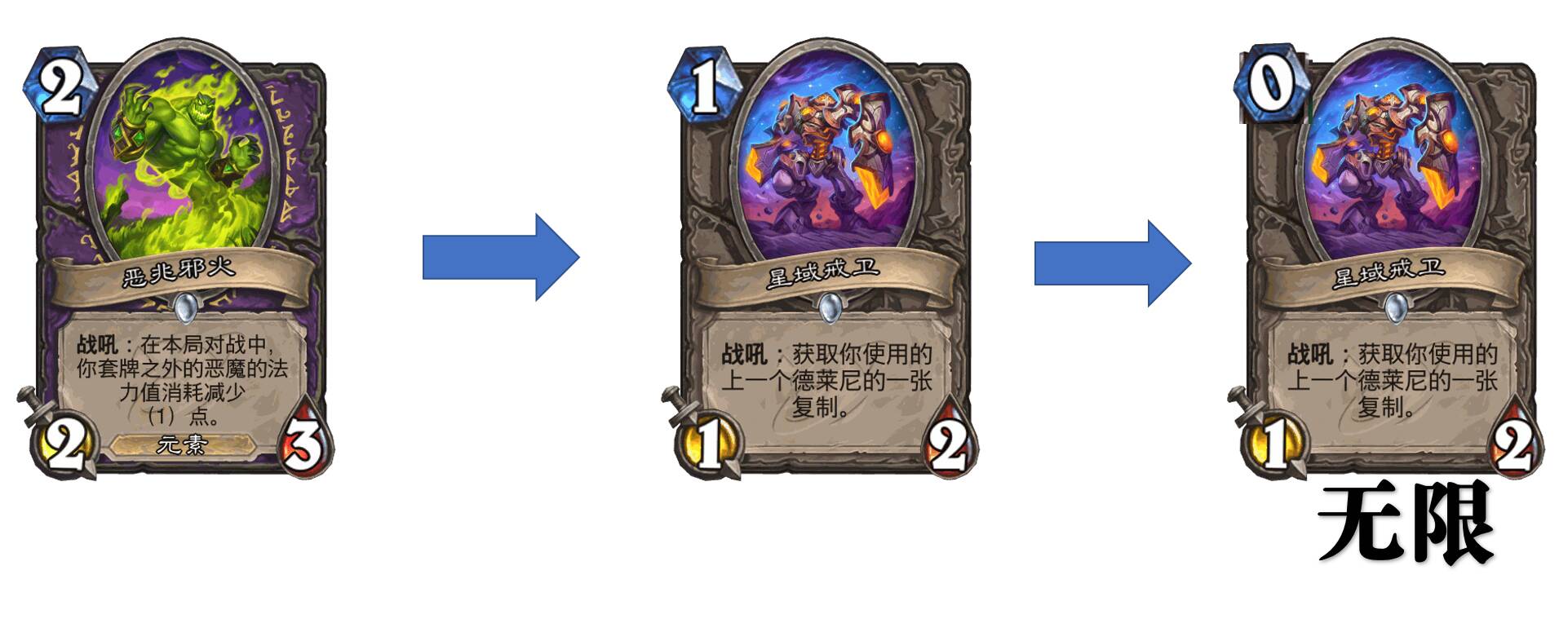 大家好,本周炉石乱斗:超级融合怪 是我个人比较喜欢的个乱斗,之前看了桃醬的卡组让我对该模式下的星域戒卫非常感兴趣,突然感觉可以利用术士的恶兆邪火配合星域戒卫可以打出超凡的化学反应。于是特化构筑出来了如下卡组,在此分享给大家。绝对是全网原创,我称其为无限星域术,原理是通过恶兆邪火将星域戒卫变成0费,然后不打任何随从,这样星域戒卫必定复制0费的星域戒卫,达到无限0费星域戒卫,然后通过术士的buff法术以及清场法术致胜,觉得好的帮我点点赞哈,最好能顶上热门,祝大家玩得愉快!!!