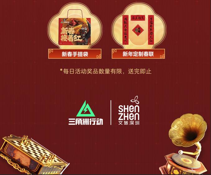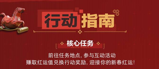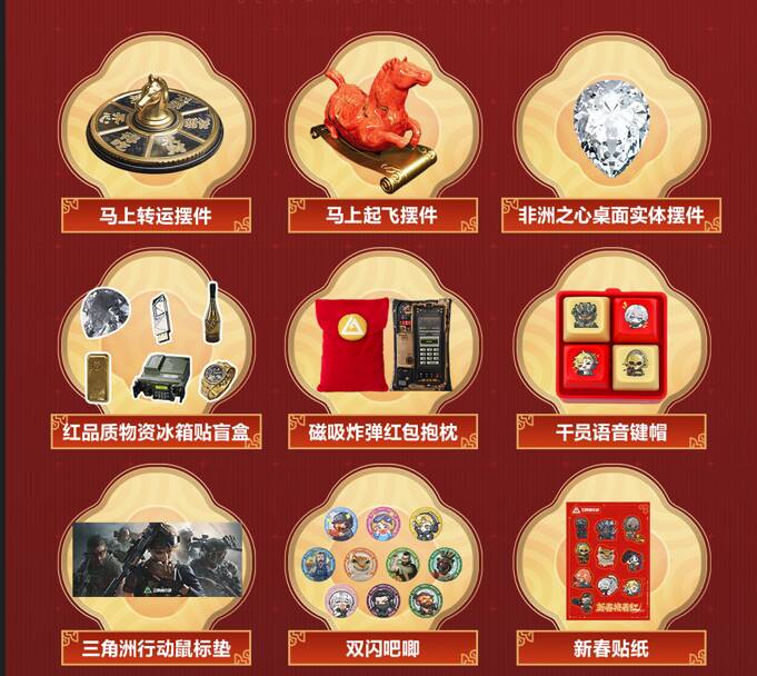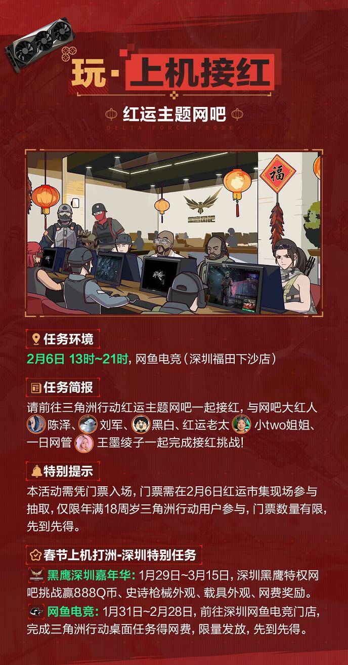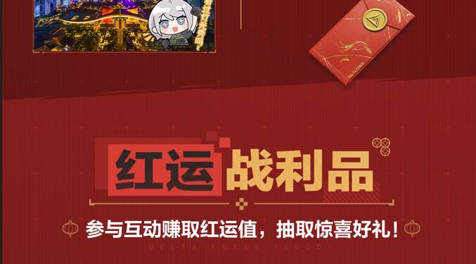 新春打卡赢好礼,专属周边等你拿!2月5日-2月12日,参与以上任意一项线下新春活动,拍摄打卡图片或视频,带双话题#三角洲深圳红运市集、#三角洲行动,发布至抖音、bilibili、快手、微信视频号、小红书、新浪微博任一平台,即可参与新春特别任务。3月1日,官方将在上述平台各抽取3位参与任务的幸运干员,送出《三角洲行动》官方周边大礼包一份。