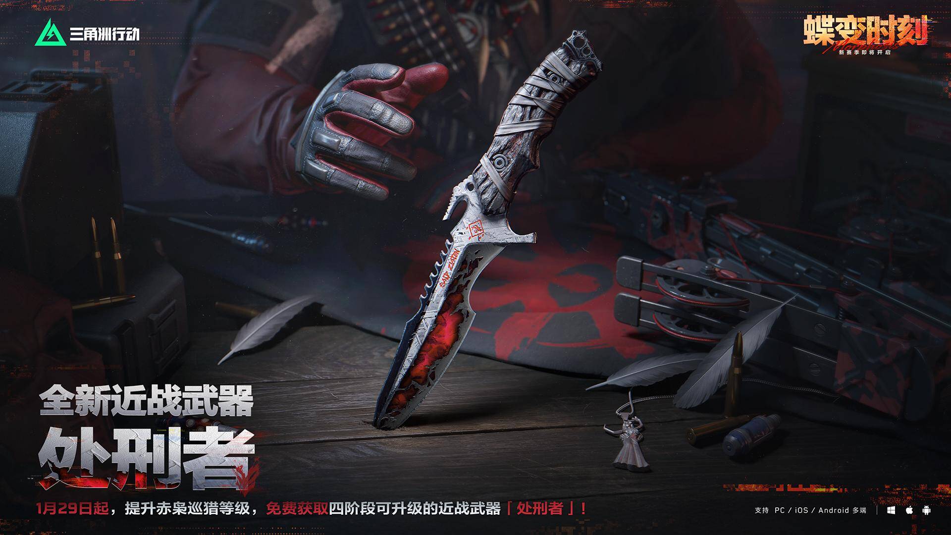 新春来洲接“红”刀!赤枭巡猎玩法已正式开放,提升赤枭巡猎等级或参与全面战场专属活动,均可免费解锁首款四阶段可升级的近战武器【处刑者】!升级可解锁全新收刀动作、检视动作与外观特效!