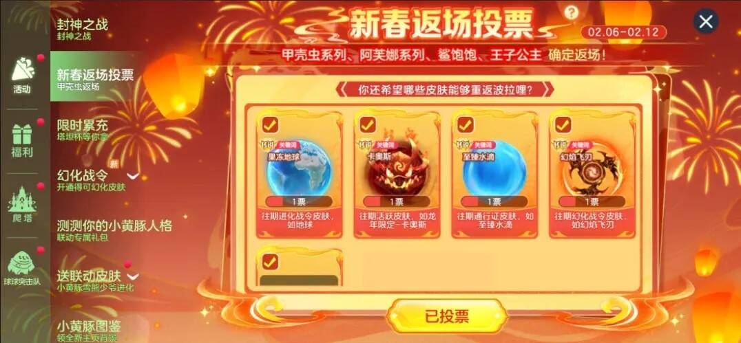 新春返场皮肤投票于2月6日至2月12日期间开启,球宝将自主决定返场皮肤!「鲨饱饱」、「甲壳虫」、「阿芙娜」已确认回归,更多皮肤由你票选。