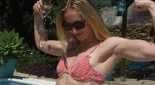 索菲·特纳身穿青绿色背心和棕黑色短裤,戴着红色墨镜,腰间挎着双枪枪套。你觉得索菲这一版劳拉形象如何?