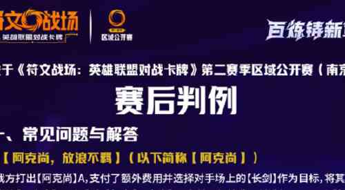 首先感谢各位对《符文战场:英雄联盟对战卡牌》(以下简称“符文战场”)的关注与支持!伴随第二赛季区域公开赛-福州站圆满收官,我们认真收集并整理了各位召唤师在赛事执行、判罚标准等方面的讨论和反馈,现针对赛事中的常见问题进行统一说明与解答。