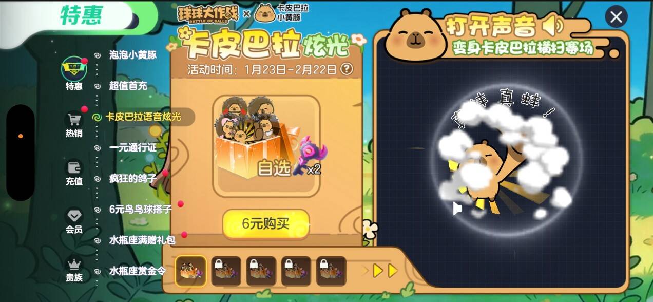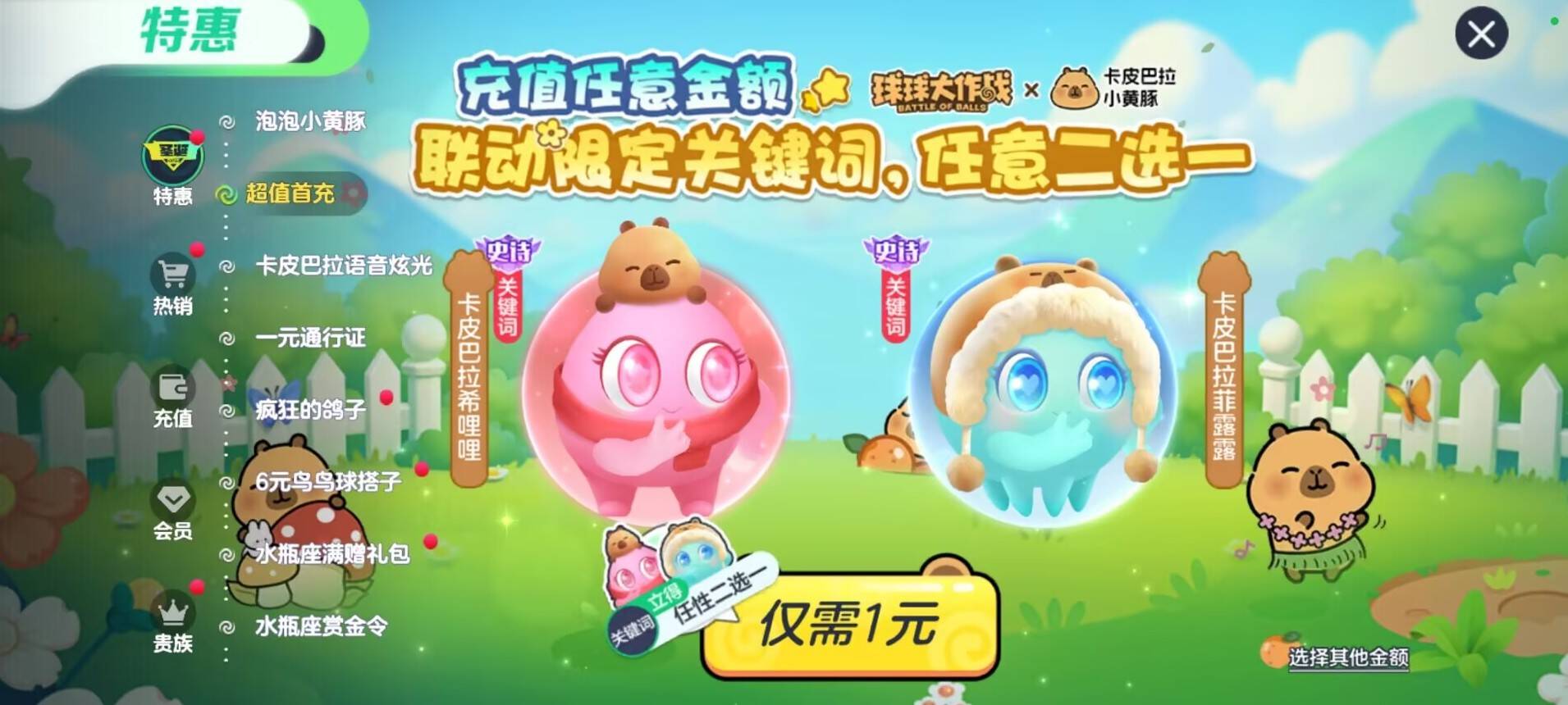 1月23日起,仅需 1元即可从「卡皮巴拉希哩哩」或「卡皮巴拉菲露露」中任选其一,6元续充再得另一款。累计7元带走两款呆萌联动皮肤,并解锁连续登录豪礼,累登2天立得「龙晶*66」、更有专属炫光等超值好礼惊喜获取!